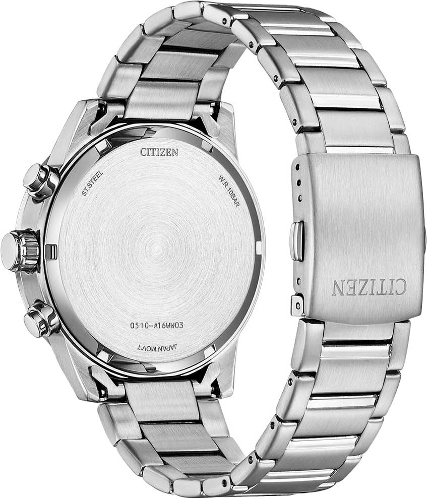 Citizen Chronograph AN3681-57E часы-хронографХронографФункция позволяет измерять отрезки времени с особой точностью: часы, минуты, секунды. Верным признаком хронографа является наличие на циферблате 3 дополнительных окошек-счётчиков. с секундомеромСекундомерСекундоме́р — прибор, способный измерять интервалы времени с точностью до долей секунды. спортивного дизайна с высоким уровнем водозащиты. Корпус из нержавеющей стали диаметром 44 мм идеально сбалансирован. Минеральное стеклоМинеральное стеклоМинеральное стекло представляет собой искусственно выращенный минерал кварца. Такое стекло отличается особой устойчивостью к повреждениям и царапинам. Уступает по некоторым качествам сапфировому стеклу. обеспечивает отличную защиту циферблата от царапин. Часы работают на основе кварцевого механизма. Стальной браслет на раскладной застёжкеРаскладная застёжкаТакой тип застёжки используется только на браслетах из металла. Она никогда не раскрывается полностью, происходит разделение на 2 и более частей. Раскладывающая застёжка снизит вероятность потери часов к минимуму. идеально дополняют дизайн часов, обеспечивая комфортное ношение. Стрелки и метки на циферблате имеют люминесцентное покрытиеЛюминесцентное покрытиеПозволяет считывать показания времени в темноте. Производители наносят на стрелки, часовые индексы, безель или поверхность циферблата светонакопительный состав, дающий холодное свечение. позволяющее легко определять время даже в темноте. БезельБезельВнешний ободок, закрепляющий стекло. В спортивных часах так называется поворотное кольцо с делениями на циферблате, выполняет роль таймера – замеряет отрезки времени на шкале. Неподвижный безель – элемент декора. Однонаправленно вращающийся безель на дайверских часах позволяет фиксировать моменты погружения и выныривания на поверхность. с IP-покрытиемIP-покрытиеМетод ионного напыления. Демонстрирует повышенную устойчивость к истиранию, окислению и химическим веществам. Под воздействием высокого давления и температуры около 1500°C молекулы металла надёжно соединяются с частицами корпуса часов. и шкалой тахиметраТахиметрРазмеченная шкала, располагается на ободке или безеле часов. Тахиметр позволяет рассчитать скорость на определённом участке пути, расстояние измеряется в километрах или милях.. Секундомер с точностью 1с и временем измерения 12ч отображается центральной стрелкой. Циферблат с метками в виде штрихов выполнен по технологии Sunray (солнечные лучи). Окошко даты находится в положении 3 часа. Часы обладают впечатляющей водонепроницаемостью до 100WR, что делает их идеальными для повседневной носки.
