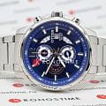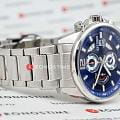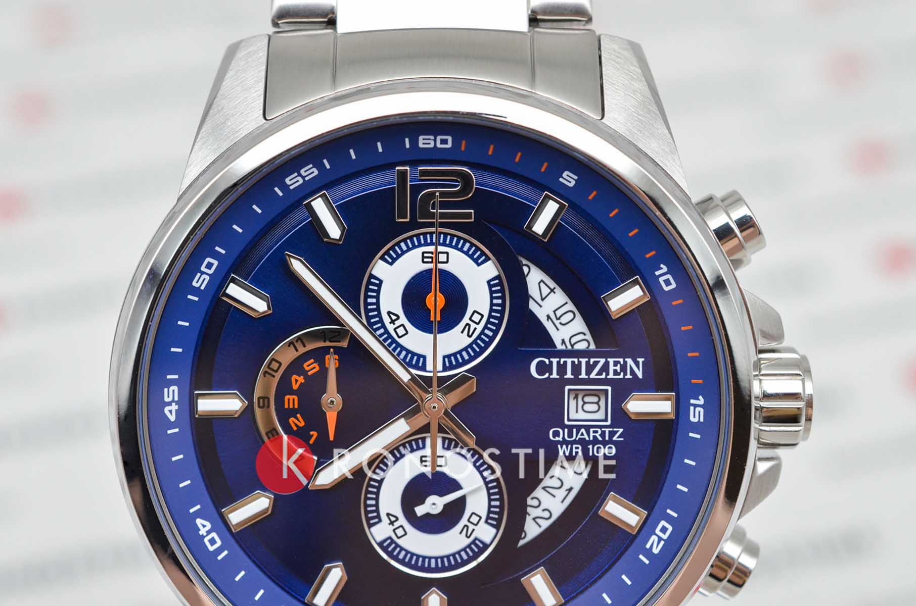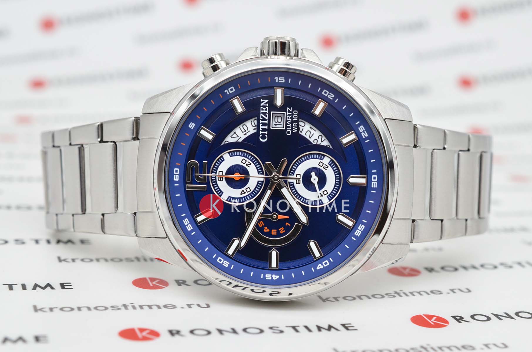 Citizen Chronograph AN3690-56L часы-хронографХронографФункция позволяет измерять отрезки времени с особой точностью: часы, минуты, секунды. Верным признаком хронографа является наличие на циферблате 3 дополнительных окошек-счётчиков. с секундомеромСекундомерСекундоме́р — прибор, способный измерять интервалы времени с точностью до долей секунды. спортивного дизайна с высоким уровнем водозащиты. Корпус из нержавеющей стали диаметром 44 мм идеально сбалансирован. Минеральное стеклоМинеральное стеклоМинеральное стекло представляет собой искусственно выращенный минерал кварца. Такое стекло отличается особой устойчивостью к повреждениям и царапинам. Уступает по некоторым качествам сапфировому стеклу. обеспечивает отличную защиту циферблата от царапин. Часы работают на основе кварцевого механизма. Стальной браслет на раскладной застёжкеРаскладная застёжкаТакой тип застёжки используется только на браслетах из металла. Она никогда не раскрывается полностью, происходит разделение на 2 и более частей. Раскладывающая застёжка снизит вероятность потери часов к минимуму. идеально дополняют дизайн часов, обеспечивая комфортное ношение. Секундомер с точностью 1с и временем измерения 12ч отображается центральной стрелкой. Циферблат с метками в виде штрихов выполнен по технологии Sunray (солнечные лучи). Окошко даты находится в положении 3 часа. Заводная головка с защитой. Часы обладают впечатляющей водонепроницаемостью до 100WR, что делает их идеальными для повседневной носки.