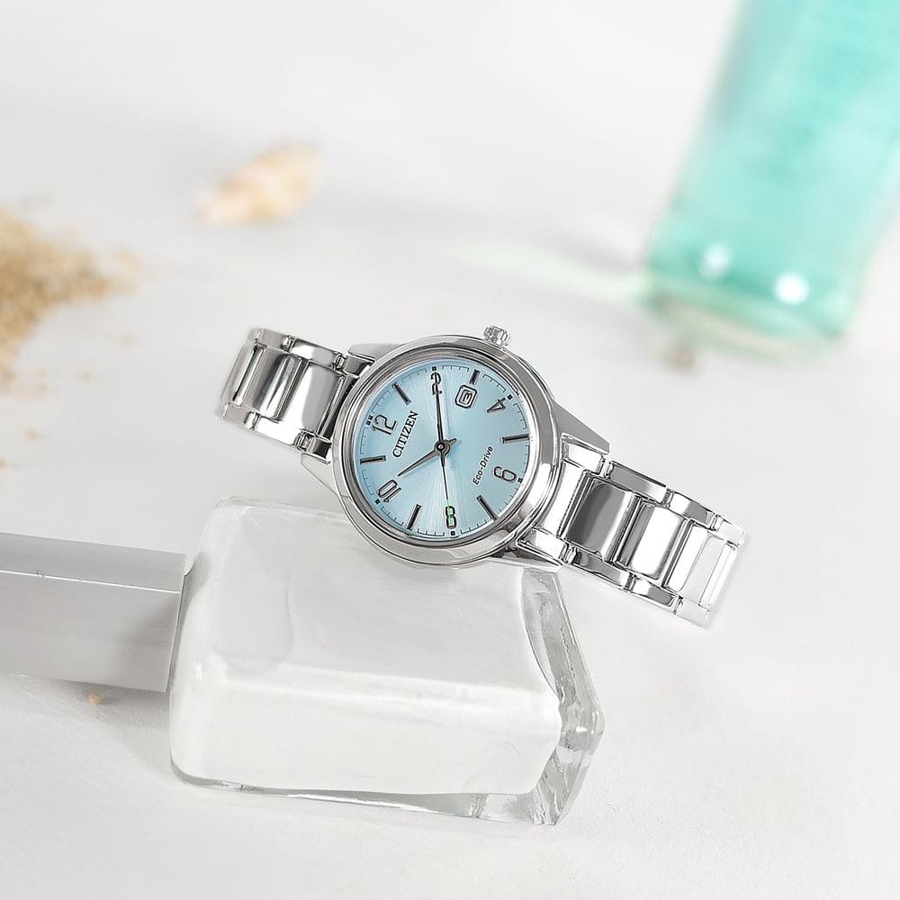 Citizen FE1241-71L — изящные японские часы, сочетающие современные технологии и классический стиль. Модель оснащена надежным кварцевым механизмом Citizen J710 с инновационной системой Eco-Drive, обеспечивающей питание от солнечной энергии без необходимости замены батарейки. Корпус и браслет выполнены из высококачественной нержавеющей стали, что гарантирует долговечность и комфорт при ежедневном ношении. Браслет оснащен надежной раскладной застёжкойРаскладная застёжкаТакой тип застёжки используется только на браслетах из металла. Она никогда не раскрывается полностью, происходит разделение на 2 и более частей. Раскладывающая застёжка снизит вероятность потери часов к минимуму. с системой блокировки, что обеспечивает дополнительную безопасность при ношении. Защиту от мелких повреждений обеспечивает прочное минеральное стеклоМинеральное стеклоМинеральное стекло представляет собой искусственно выращенный минерал кварца. Такое стекло отличается особой устойчивостью к повреждениям и царапинам. Уступает по некоторым качествам сапфировому стеклу.. Голубой циферблат, выполненный по технологии Sunray (солнечные лучи), украшен аккуратными часовыми метками и арабскими цифрами, предусмотрена функция индикации даты. Функция индикации заряда EOLEOLПредставляет собой систему, уведомляющую владельца часов о необходимости замены элемента питания. За 2 недели до полного разряда батарейки секундная стрелка перестаёт ходить чётко и начинает перепрыгивать на 3-4 деления. своевременно подскажет о необходимости подзарядки. Водостойкость WR 30 позволяет не беспокоиться о случайных брызгах воды. Диаметр корпуса составляет 29,4 мм, что делает модель особенно элегантной и удобной.