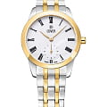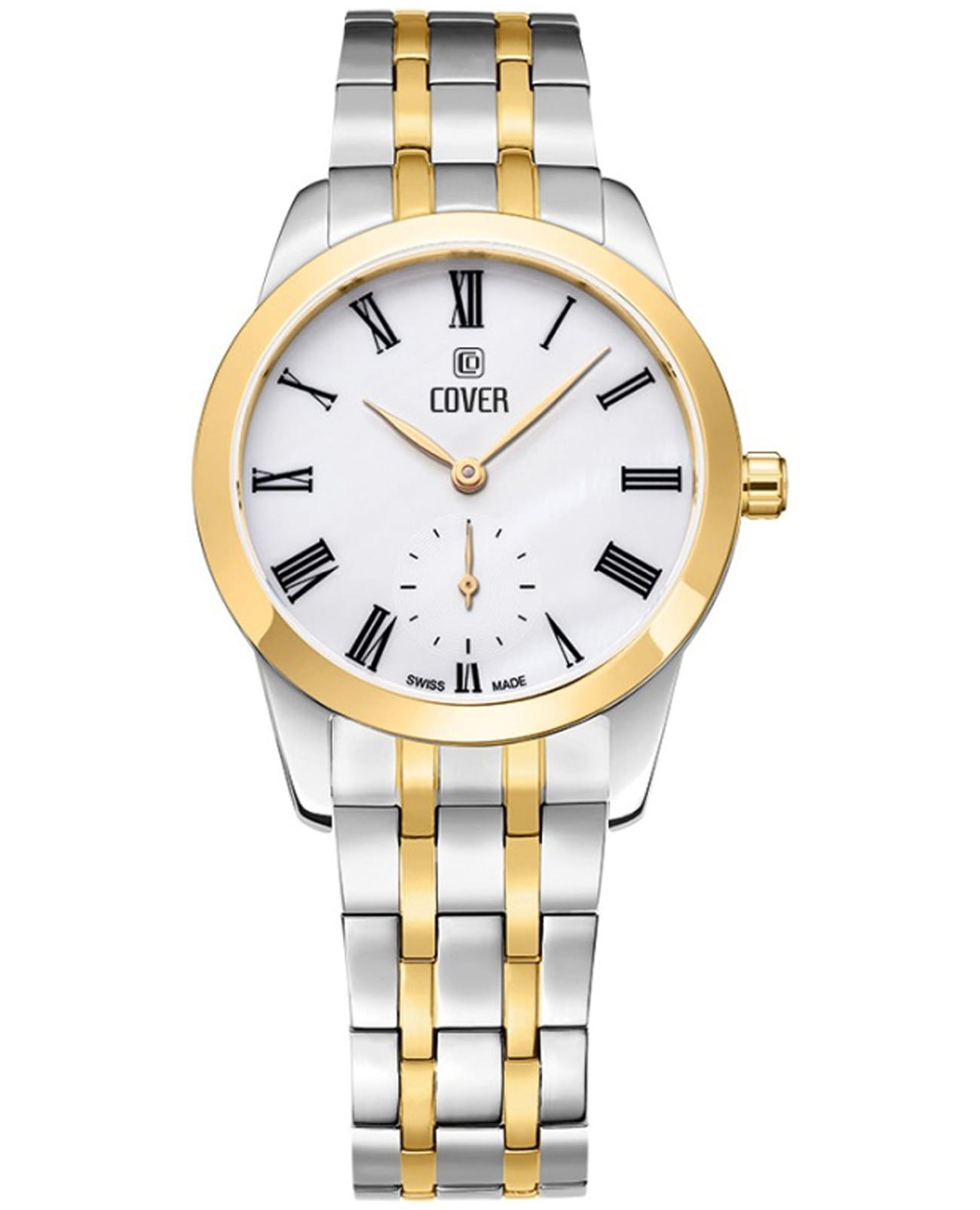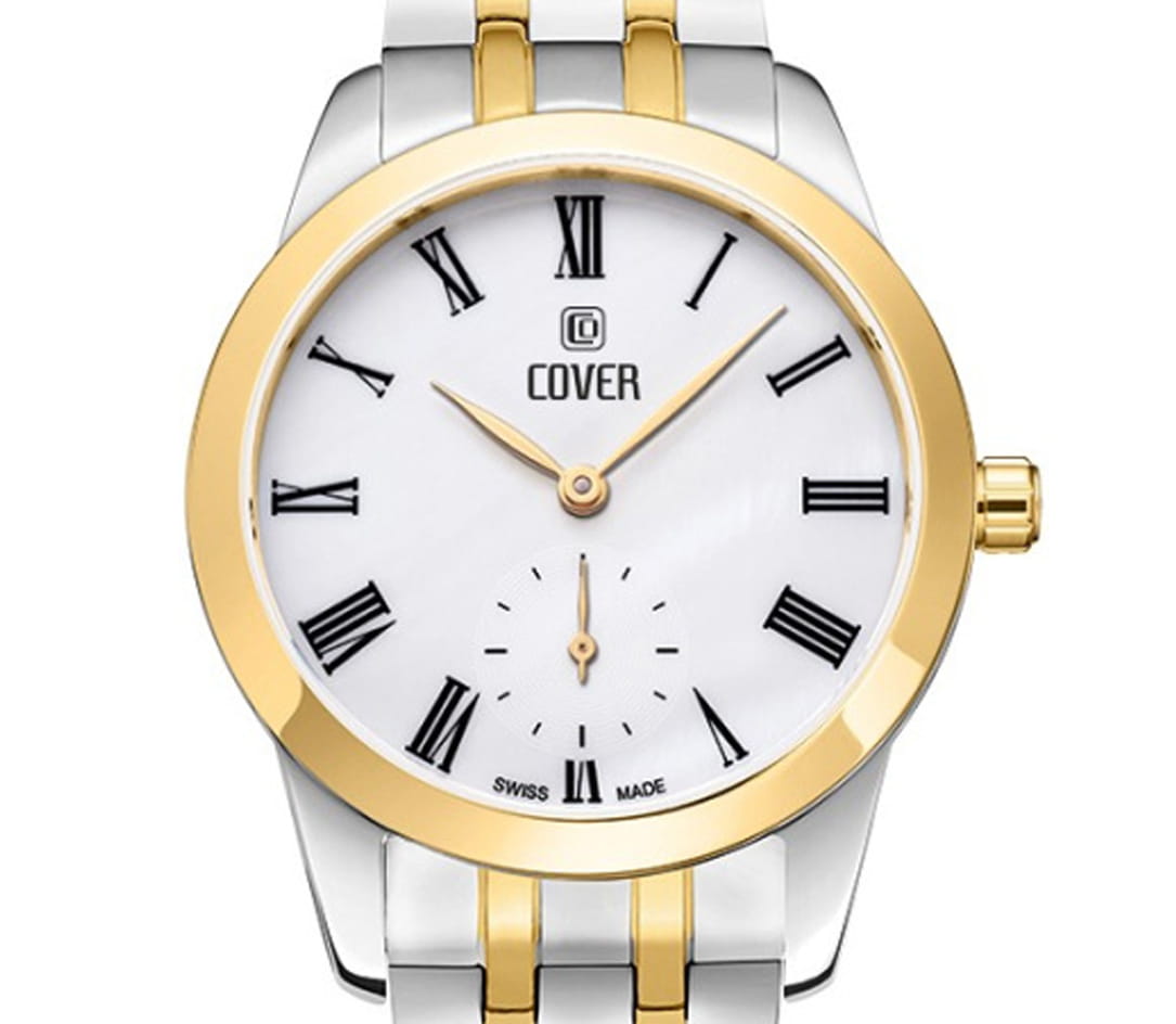 Часы Cover Nobila CO195.08 - это аксессуар для истинных леди из коллекции Nobila. Часы работают на кварцевом калибре Ronda. Белый циферблат украшен печатными римскими цифрами и субдиском малой секундной стрелки на «6 часах» и защищен минеральным стекломМинеральное стеклоМинеральное стекло представляет собой искусственно выращенный минерал кварца. Такое стекло отличается особой устойчивостью к повреждениям и царапинам. Уступает по некоторым качествам сапфировому стеклу. с сапфировым напылением. Корпус диаметром 32 мм выполнен из нержавеющей стали. Широкий полированный безельБезельВнешний ободок, закрепляющий стекло. В спортивных часах так называется поворотное кольцо с делениями на циферблате, выполняет роль таймера – замеряет отрезки времени на шкале. Неподвижный безель – элемент декора. Однонаправленно вращающийся безель на дайверских часах позволяет фиксировать моменты погружения и выныривания на поверхность. с PVD-покрытиемPVDУльтратонкое покрытие наносится в технике вакуумного напыления, сочетает в себе нитрид титана особой прочности со слоем золота или оксида хрома. Несёт в себе декоративную или защитную функцию. цвета желтого золота. Интегрированный браслет состоит из 5 звеньев, на раскладной застёжкеРаскладная застёжкаТакой тип застёжки используется только на браслетах из металла. Она никогда не раскрывается полностью, происходит разделение на 2 и более частей. Раскладывающая застёжка снизит вероятность потери часов к минимуму.. Часы имеют маркировку «Swiss Made».