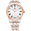 Часы Cover Nobila CO195.09 - это аксессуар для истинных леди из коллекции Nobila. Часы работают на кварцевом калибре Ronda. Белый циферблат украшен печатными римскими цифрами и субдиском малой секундной стрелки на «6 часах» и защищен минеральным стекломМинеральное стеклоМинеральное стекло представляет собой искусственно выращенный минерал кварца. Такое стекло отличается особой устойчивостью к повреждениям и царапинам. Уступает по некоторым качествам сапфировому стеклу. с сапфировым напылением. Корпус диаметром 32 мм выполнен из нержавеющей стали. Широкий полированный безельБезельВнешний ободок, закрепляющий стекло. В спортивных часах так называется поворотное кольцо с делениями на циферблате, выполняет роль таймера – замеряет отрезки времени на шкале. Неподвижный безель – элемент декора. Однонаправленно вращающийся безель на дайверских часах позволяет фиксировать моменты погружения и выныривания на поверхность. с PVD-покрытиемPVDУльтратонкое покрытие наносится в технике вакуумного напыления, сочетает в себе нитрид титана особой прочности со слоем золота или оксида хрома. Несёт в себе декоративную или защитную функцию. цвета розового золота. Интегрированный браслет состоит из 5 звеньев, на раскладной застёжкеРаскладная застёжкаТакой тип застёжки используется только на браслетах из металла. Она никогда не раскрывается полностью, происходит разделение на 2 и более частей. Раскладывающая застёжка снизит вероятность потери часов к минимуму.. Часы имеют маркировку «Swiss Made».
