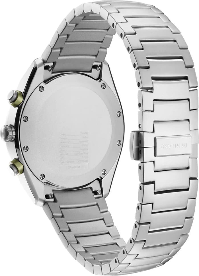 Элегантный хронограф D1 Milano Cronografo Essential White CHBJ20 - идеальное воплощение мужественности и стиля. Этот многофункциональный аксессуар оснащен секундомером, тахиметромТахиметрРазмеченная шкала, располагается на ободке или безеле часов. Тахиметр позволяет рассчитать скорость на определённом участке пути, расстояние измеряется в километрах или милях.. что делает его незаменимым компаньоном в повседневной жизни. Изысканный корпус и браслет выполнены из стали. Неподвижный безельБезельВнешний ободок, закрепляющий стекло. В спортивных часах так называется поворотное кольцо с делениями на циферблате, выполняет роль таймера – замеряет отрезки времени на шкале. Неподвижный безель – элемент декора. Однонаправленно вращающийся безель на дайверских часах позволяет фиксировать моменты погружения и выныривания на поверхность. из нержавеющей стали с PVD-покрытиемPVDУльтратонкое покрытие наносится в технике вакуумного напыления, сочетает в себе нитрид титана особой прочности со слоем золота или оксида хрома. Несёт в себе декоративную или защитную функцию.. Минималистичный дизайн циферблата, защищенный прочным сапфировым стекломСапфировое стеклоПрочный и надёжный материал из кристалла сапфира синтетического происхождения, характеризующийся особой твёрдостью и устойчивостью к царапинам и повреждениям. с антибликовым покрытиемАнтибликовое покрытиеСлой оксида металла в 0,13-0,3 микрон, благодаря которому стекло часов не бликует и не отражает свет. Антибликовое покрытие уменьшает отражение света в 10 раз, обеспечивая отличную читаемость показателей циферблата., привлекает внимание своей сдержанной красотой. Стрелки с люминесцентным покрытиемЛюминесцентное покрытиеПозволяет считывать показания времени в темноте. Производители наносят на стрелки, часовые индексы, безель или поверхность циферблата светонакопительный состав, дающий холодное свечение., обеспечивающим хорошую читаемость в темноте. Надежная конструкция с задней крышкой на 8 винтах и стильный браслет с удобной застёжкой «бабочка» с кнопкамиЗастёжка "бабочка"Такой вид застёжки дополняется предохранителями, помогающими избежать случайного раскрытия браслета. Обладают изящным исполнением. обеспечивают комфорт при ношении. Водозащита 50 метров защищает часы от брызг и дождя, делая их подходящими для повседневного использования. Это не просто часы, а статусный аксессуар, подчеркивающий безупречный вкус и внимание к деталям своего владельца.