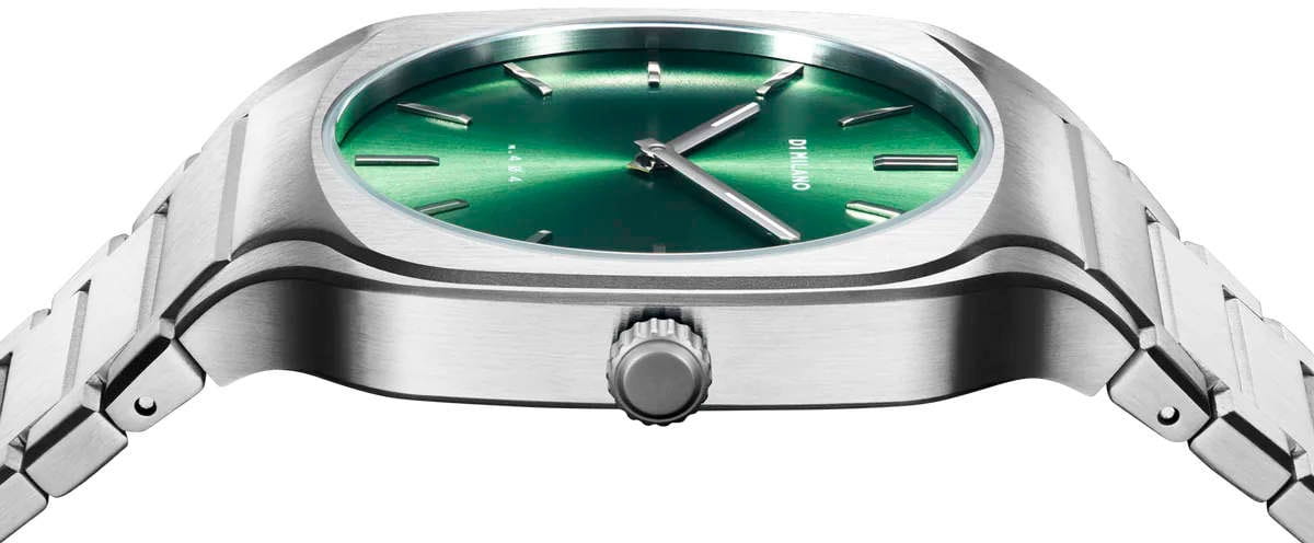 Часы D1 Milano SQBJ06 — это уникальные кварцевые часы, которые подчеркнут ваш изысканный стиль. Эти наручные часы с эффектным монохромным дизайном станут выразительным акцентом вашего образа. Квадратный корпус из стали с сатинированной отделкой и габаритами 37х37 мм придает часам современный и утонченный вид. Зеленый циферблат, выполненный по технологии Sunray, украшен накладными метками в виде штрихов, а серебристые хроматические стрелки и индексы создают стильный контраст, подчёркивая элегантность модели. Задняя крышка из нержавеющей стали закреплена на 4-х винтах и дополнена индивидуальным серийным номером, что подчеркивает уникальность каждого экземпляра. Стальной браслет с раскладной застёжкойРаскладная застёжкаТакой тип застёжки используется только на браслетах из металла. Она никогда не раскрывается полностью, происходит разделение на 2 и более частей. Раскладывающая застёжка снизит вероятность потери часов к минимуму. обеспечивает надежность и комфорт в повседневном использовании. Сапфировое стеклоСапфировое стеклоПрочный и надёжный материал из кристалла сапфира синтетического происхождения, характеризующийся особой твёрдостью и устойчивостью к царапинам и повреждениям. с антибликовым покрытием защищает циферблат, а водозащита до 50WR делает эти часы практичным выбором для любых условий. Благодаря калибру Miyota 1L22, они отличаются точностью и надежностью. Эти итальянские часы представляют собой идеальное сочетание традиционного мастерства и инновационного подхода, воплощая в себе новый взгляд на классическую элегантность.