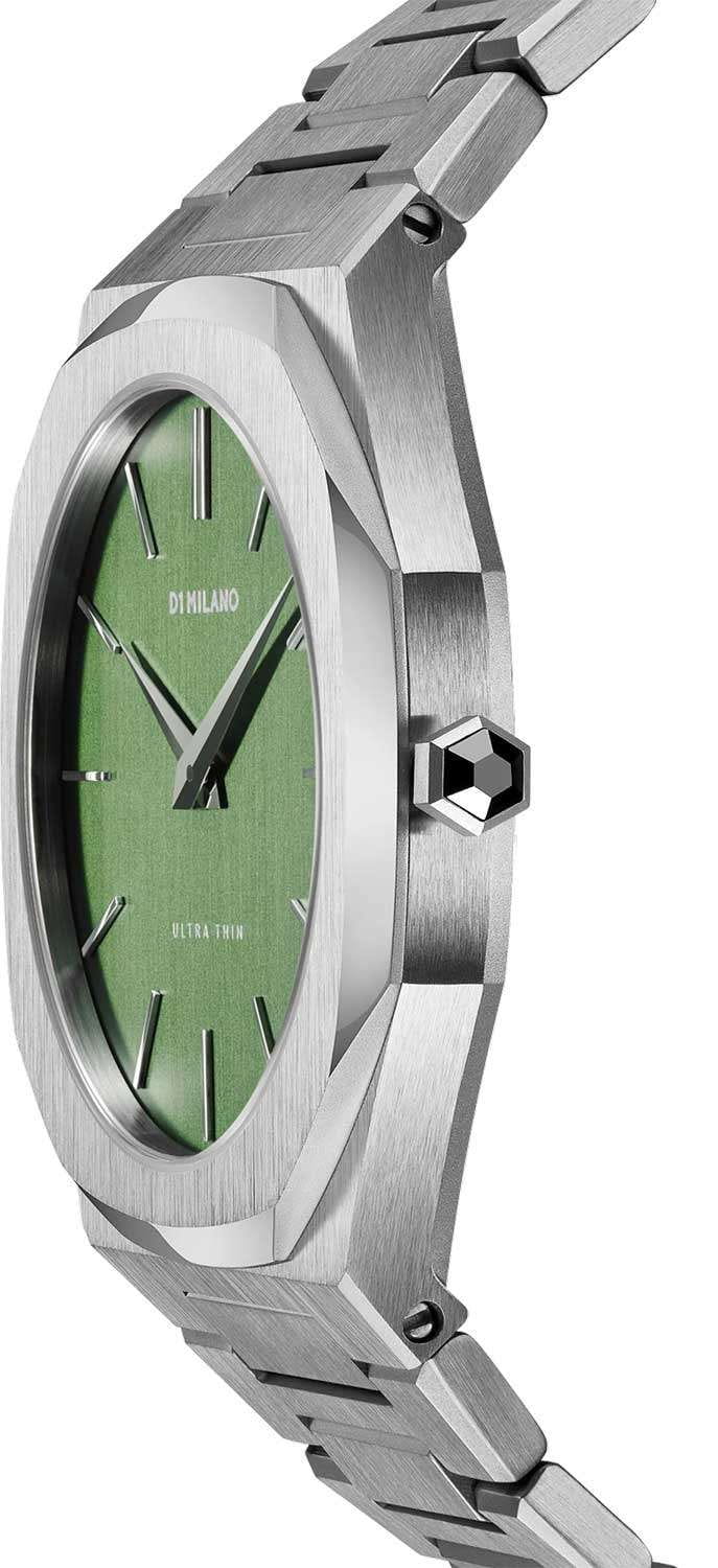 Часы D1 Milano UTBJ06 — это уникальные кварцевые часы, которые подчеркнут ваш изысканный стиль. Эти наручные часы из коллекции Ultra Thin с эффектным монохромным дизайном станут выразительным акцентом вашего образа. Корпус диаметром 40 мм из нержавеющей стали придает часам современный и утонченный вид. Зеленый циферблат метками в виде штрихов, а серебристые хроматические стрелки и индексы создают стильный контраст, подчёркивая элегантность модели. Задняя крышка из нержавеющей стали закреплена на 8-х винтах и дополнена индивидуальным серийным номером, что подчеркивает уникальность каждого экземпляра. Стальной браслет с раскладной застёжкойРаскладная застёжкаТакой тип застёжки используется только на браслетах из металла. Она никогда не раскрывается полностью, происходит разделение на 2 и более частей. Раскладывающая застёжка снизит вероятность потери часов к минимуму. обеспечивает надежность и комфорт в повседневном использовании. Сапфировое стеклоСапфировое стеклоПрочный и надёжный материал из кристалла сапфира синтетического происхождения, характеризующийся особой твёрдостью и устойчивостью к царапинам и повреждениям. с антибликовым покрытием защищает циферблат, а водозащита до 50WR делает эти часы практичным выбором для любых условий. Благодаря калибру Miyota 1L22, они отличаются точностью и надежностью. Эти итальянские часы представляют собой идеальное сочетание традиционного мастерства и инновационного подхода, воплощая в себе новый взгляд на классическую элегантность.