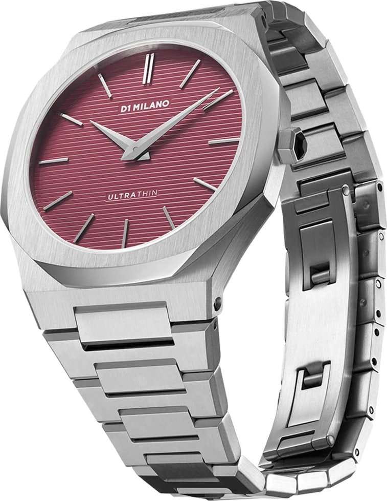Часы D1 Milano UTBJ11 — это уникальные кварцевые часы, которые подчеркнут ваш изысканный стиль. Эти наручные часы из коллекции Ultra Thin с эффектным монохромным дизайном станут выразительным акцентом вашего образа. Корпус диаметром 40 мм из нержавеющей стали придает часам современный и утонченный вид. Красный циферблат метками в виде штрихов, а серебристые хроматические стрелки и индексы создают стильный контраст, подчёркивая элегантность модели. Задняя крышка из нержавеющей стали закреплена на 8-х винтах и дополнена индивидуальным серийным номером, что подчеркивает уникальность каждого экземпляра. Стальной браслет с раскладной застёжкойРаскладная застёжкаТакой тип застёжки используется только на браслетах из металла. Она никогда не раскрывается полностью, происходит разделение на 2 и более частей. Раскладывающая застёжка снизит вероятность потери часов к минимуму. обеспечивает надежность и комфорт в повседневном использовании. Сапфировое стеклоСапфировое стеклоПрочный и надёжный материал из кристалла сапфира синтетического происхождения, характеризующийся особой твёрдостью и устойчивостью к царапинам и повреждениям. с антибликовым покрытием защищает циферблат, а водозащита до 50WR делает эти часы практичным выбором для любых условий. Благодаря калибру Miyota 1L22, они отличаются точностью и надежностью. Эти итальянские часы представляют собой идеальное сочетание традиционного мастерства и инновационного подхода, воплощая в себе новый взгляд на классическую элегантность.