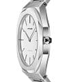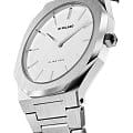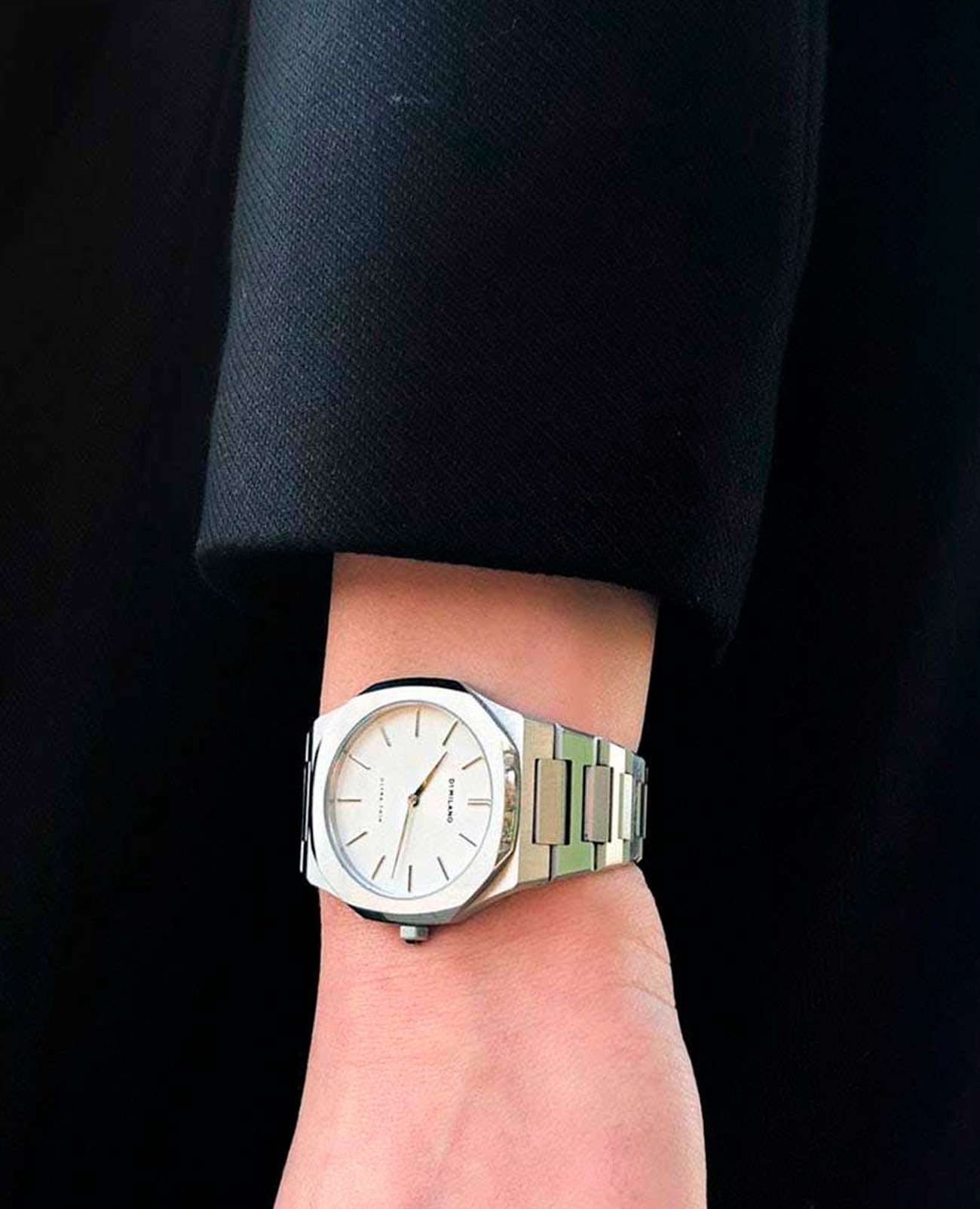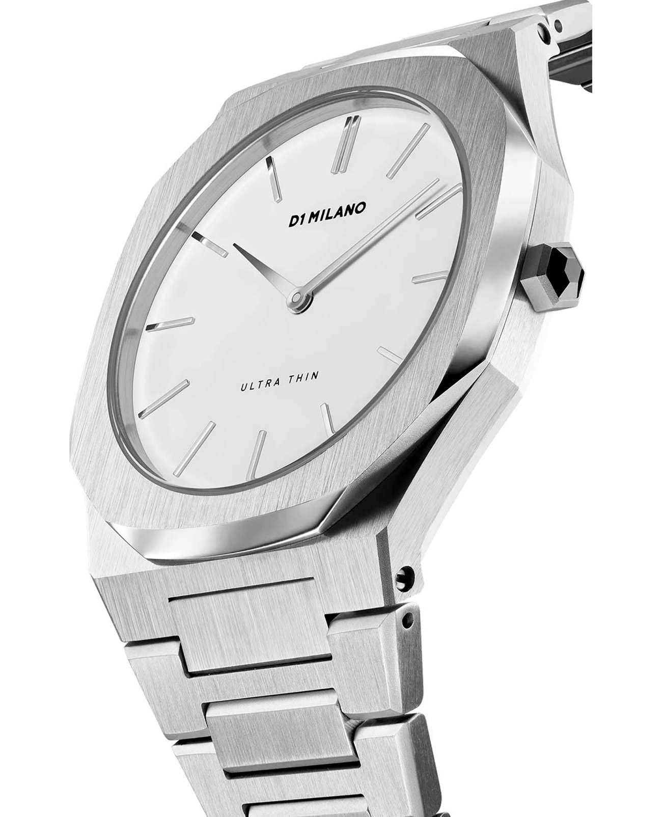 Женские наручные часы D1 Milano UTBL01 из коллекции Ultra Thin сочетают в себе классический дизайн и современные технологии. Модель обладает восьмиугольным корпусом диаметром 38 мм, изготовленным из нержавеющей стали 316L, что обеспечивает высокую устойчивость к внешним воздействиям. Браслет также выполнен из нержавеющей стали с раскладной застежкойРаскладной замокДанный вариант застежки используется только на часах с металлическим браслетом. Отличительная особенность такого крепления в том, что длина браслета становится универсальной и вы можете самостоятельно отрегулировать нужный вам размер – застежка просто двигается по браслету часов., гарантирующей комфортное ношение и безопасность. Белый циферблат украшен метками и оснащен стрелочным механизмом, который подчеркивает элегантность модели. Для защиты используется сапфировое стеклоСапфировое стеклоПрочный и надёжный материал из кристалла сапфира синтетического происхождения, характеризующийся особой твёрдостью и устойчивостью к царапинам и повреждениям. с антибликовым покрытиемАнтибликовое покрытиеСлой оксида металла в 0,13-0,3 микрон, благодаря которому стекло часов не бликует и не отражает свет. Антибликовое покрытие уменьшает отражение света в 10 раз, обеспечивая отличную читаемость показателей циферблата., обеспечивающее прочную защиту от царапин и бликов. Часы работают на кварцевом механизме, что гарантирует точность хода с погрешностью +/- 15 секунд в месяц, не требуя регулярного подзавода. Водонепроницаемость часов достигает 5 атмосфер (50 метров), что позволяет использовать их во время мытья рук или плавания, однако не рекомендуется для глубоководного дайвинга. Толщина ультратонкого корпуса составляет всего 6 мм, делая аксессуар легким и удобным для повседневного использования.
