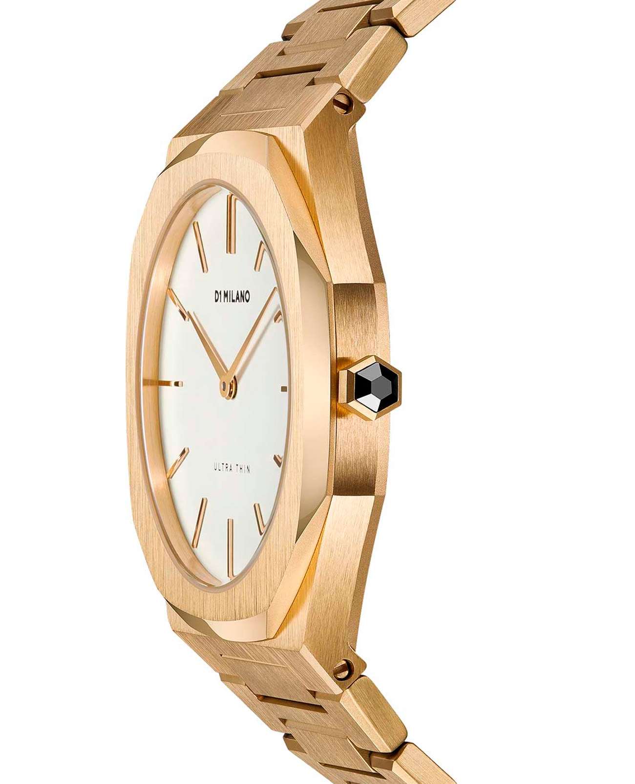 Женские наручные часы D1 Milano UTBL03 из коллекции Ultra Thin сочетают в себе классический дизайн и современные технологии. Модель обладает круглым корпусом диаметром 38 мм, изготовленным из нержавеющей стали с PVDPVDУльтратонкое покрытие наносится в технике вакуумного напыления, сочетает в себе нитрид титана особой прочности со слоем золота или оксида хрома. Несёт в себе декоративную или защитную функцию.-покрытием, что обеспечивает высокую устойчивость к внешним воздействиям. Браслет также выполнен из нержавеющей стали с раскладной застежкойРаскладной замокДанный вариант застежки используется только на часах с металлическим браслетом. Отличительная особенность такого крепления в том, что длина браслета становится универсальной и вы можете самостоятельно отрегулировать нужный вам размер – застежка просто двигается по браслету часов., гарантирующей комфортное ношение и безопасность. Циферблат украшен метками в виде штрихов и оснащен стрелочным механизмом, который подчеркивает элегантность модели. Для защиты используется сапфировое стеклоСапфировое стеклоПрочный и надёжный материал из кристалла сапфира синтетического происхождения, характеризующийся особой твёрдостью и устойчивостью к царапинам и повреждениям. с антибликовым покрытиемАнтибликовое покрытиеСлой оксида металла в 0,13-0,3 микрон, благодаря которому стекло часов не бликует и не отражает свет. Антибликовое покрытие уменьшает отражение света в 10 раз, обеспечивая отличную читаемость показателей циферблата., обеспечивающее прочную защиту от царапин и бликов. Часы работают на кварцевом механизме, что гарантирует точность хода с погрешностью +/- 15 секунд в месяц, не требуя регулярного подзавода. Водонепроницаемость часов достигает 5 атмосфер (50 метров), что позволяет использовать их во время мытья рук или плавания, однако не рекомендуется для глубоководного дайвинга. Толщина ультратонкого корпуса составляет всего 6 мм, делая аксессуар легким и удобным для повседневного использования.
