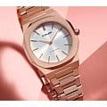 Женские наручные часы D1 Milano UTBL09 из коллекции Ultra Thin сочетают в себе элегантный дизайн и современные технологии. Модель обладает тоннельным корпусом диаметром 34 мм, изготовленным из высококачественной нержавеющей стали 316L с PVD-покрытиемPVDУльтратонкое покрытие наносится в технике вакуумного напыления, сочетает в себе нитрид титана особой прочности со слоем золота или оксида хрома. Несёт в себе декоративную или защитную функцию. в розовое золото, что обеспечивает устойчивость к внешним воздействиям. Толщина ультратонкого корпуса составляет всего 6 мм, делая аксессуар легким и удобным для повседневного использования. Браслет также выполнен из нержавеющей стали с раскладной застежкойРаскладной замокДанный вариант застежки используется только на часах с металлическим браслетом. Отличительная особенность такого крепления в том, что длина браслета становится универсальной и вы можете самостоятельно отрегулировать нужный вам размер – застежка просто двигается по браслету часов., гарантирующей комфортное ношение и безопасность. Циферблат цвета "розовое облако" украшен метками в виде штрихов и оснащен стрелочным механизмом в тон корпуса, который подчеркивает элегантность модели. Для защиты используется сапфировое стеклоСапфировое стеклоПрочный и надёжный материал из кристалла сапфира синтетического происхождения, характеризующийся особой твёрдостью и устойчивостью к царапинам и повреждениям., обеспечивающее прочную защиту от царапин и бликов. Часы работают на кварцевом механизме Miyota 1L22, гарантирующем точность хода без необходимости регулярного подзавода. Водонепроницаемость часов достигает 5 атмосфер (50 метров), что позволяет использовать их во время мытья рук или плавания, однако не рекомендуется для глубоководного дайвинга.