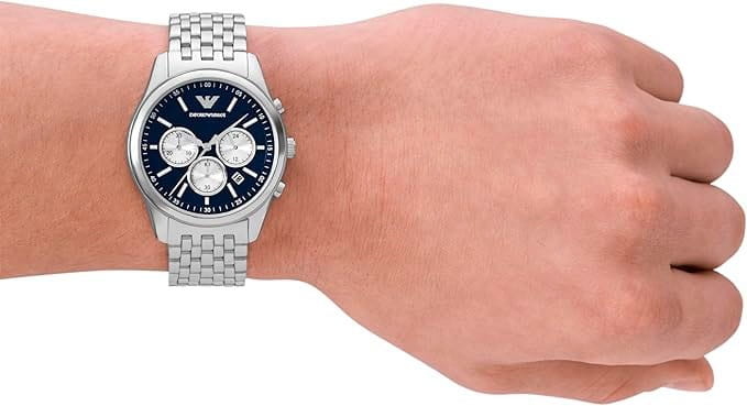 Мужские часы Emporio Armani Antonio AR11582 - стильные с кварцевым механизмом сочетают в себе элегантность и функциональность, что делает их идеальным аксессуаром для современного мужчины. Корпус часов из нержавеющей стали, что обеспечивает долговечность и устойчивость к внешним воздействиям. Минеральное стеклоМинеральное стеклоМинеральное стекло представляет собой искусственно выращенный минерал кварца. Такое стекло отличается особой устойчивостью к повреждениям и царапинам. Уступает по некоторым качествам сапфировому стеклу. защищает синий циферблат, добавляя изысканности всей конструкции. Размер корпуса составляет 41 мм, что придаёт часам солидный внешний вид, не утяжеляя при этом запястье. Часы имеют водонепроницаемость WR50 (5 атм), это позволяет использовать их в повседневной жизни, не опасаясь воздействия воды. Стальной браслет на застежке «бабочка»Застёжка "бабочка"Такой вид застёжки дополняется предохранителями, помогающими избежать случайного раскрытия браслета. Обладают изящным исполнением. обеспечивает комфортное и надёжное крепление на запястье. Этот хронографХронографФункция позволяет измерять отрезки времени с особой точностью: часы, минуты, секунды. Верным признаком хронографа является наличие на циферблате 3 дополнительных окошек-счётчиков. с функцией секундомераСекундомерСекундоме́р — прибор, способный измерять интервалы времени с точностью до долей секунды. и календарем, отображающим дату, станет идеальным аксессуаром для тех, кто ценит функциональность и итальянское качество.