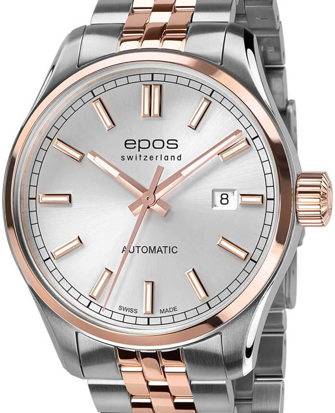 Мужские механические часы с автоподзаводом Epos 3501.132.34.18.44 образец швейцарской элегантности и точности. Круглый корпус размером 41 мм из нержавеющей стали. БезельБезельВнешний ободок, закрепляющий стекло. В спортивных часах так называется поворотное кольцо с делениями на циферблате, выполняет роль таймера – замеряет отрезки времени на шкале. Неподвижный безель – элемент декора. Однонаправленно вращающийся безель на дайверских часах позволяет фиксировать моменты погружения и выныривания на поверхность. с PVD-покрытиемPVDУльтратонкое покрытие наносится в технике вакуумного напыления, сочетает в себе нитрид титана особой прочности со слоем золота или оксида хрома. Несёт в себе декоративную или защитную функцию. цвета розового золота, серебристый циферблат с солнечной текстурой Sunray и накладными штрихами. Окошко даты расположено в положении 3 часов. Стекло — сапфировоеСапфировое стеклоПрочный и надёжный материал из кристалла сапфира синтетического происхождения, характеризующийся особой твёрдостью и устойчивостью к царапинам и повреждениям.. Стрелки и метки с люминесцентным покрытиемЛюминесцентное покрытиеПозволяет считывать показания времени в темноте. Производители наносят на стрелки, часовые индексы, безель или поверхность циферблата светонакопительный состав, дающий холодное свечение.. Механизм — швейцарский ETA 2824, запас хода до 38 часов. Водонепроницаемость 100 м. Браслет — стальной с частичным PVD-покрытиемPVDУльтратонкое покрытие наносится в технике вакуумного напыления, сочетает в себе нитрид титана особой прочности со слоем золота или оксида хрома. Несёт в себе декоративную или защитную функцию. на раскладной застёжкеРаскладная застёжкаТакой тип застёжки используется только на браслетах из металла. Она никогда не раскрывается полностью, происходит разделение на 2 и более частей. Раскладывающая застёжка снизит вероятность потери часов к минимуму.. Идеальный выбор для тех, кто ценит швейцарское качество и классический стиль.