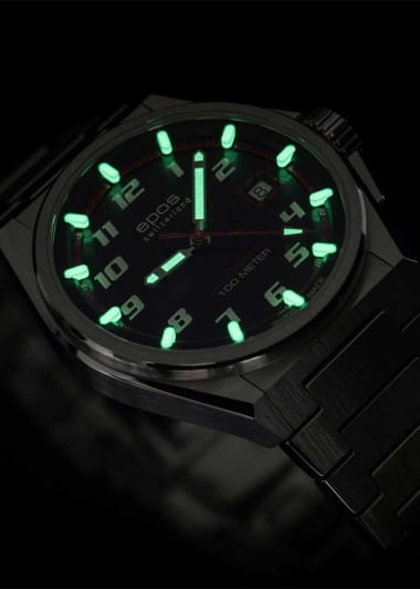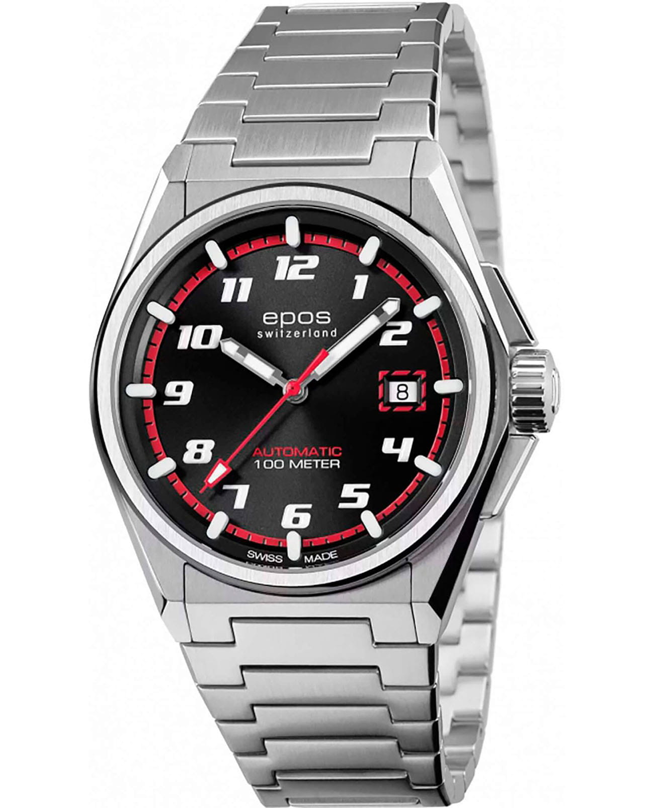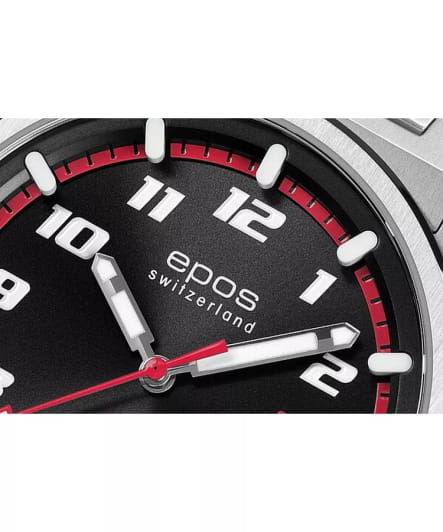 Мужские механические часы с автоподзаводом Epos из коллекции Sportive — это стильный и надёжный аксессуар с швейцарским качеством. Корпус диаметром 41 мм и толщиной 11 мм выполнен из нержавеющей стали 316L. Циферблат чёрного цвета с красными акцентами оформлен по технологии «солнечные лучи» (Sunray) и дополнен метками в виде штрихов и арабских цифр. Циферблат защищён сапфировым стекломСапфировое стеклоПрочный и надёжный материал из кристалла сапфира синтетического происхождения, характеризующийся особой твёрдостью и устойчивостью к царапинам и повреждениям.. Стрелки и объёмные метки с люминесцентным покрытиемЛюминесцентное покрытиеПозволяет считывать показания времени в темноте. Производители наносят на стрелки, часовые индексы, безель или поверхность циферблата светонакопительный состав, дающий холодное свечение., обеспечивающим отличную читаемость в темноте. Механизм — швейцарский калибр Sellita SW200 с запасом хода 38 часов. Окошко даты расположено в положении 3 часов. Завинчивающаяся коронка обеспечивает дополнительную защиту. Прозрачная задняя крышка позволяет наблюдать за работой механизма. Часы оснащены стальным браслетом на раскладной застёжкеРаскладная застёжкаТакой тип застёжки используется только на браслетах из металла. Она никогда не раскрывается полностью, происходит разделение на 2 и более частей. Раскладывающая застёжка снизит вероятность потери часов к минимуму.. Водонепроницаемость 100 м позволяет использовать часы для плавания и повседневного ношения. Гарантия — 24 месяца. Универсальный выбор для ценителя механики и спортивного стиля.