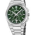 Мужские кварцевые часы Festina из коллекции Rivé — это элегантный аксессуар с швейцарским качеством и функциональным дизайном. Корпус диаметром 42,5 мм и толщиной 12 мм выполнен из нержавеющей стали серебряного цвета. Циферблат тёмно-зелёного цвета дополнен малым циферблатом для секунд и окошком даты в положении 3 часов. Циферблат защищён сапфировым стекломСапфировое стеклоПрочный и надёжный материал из кристалла сапфира синтетического происхождения, характеризующийся особой твёрдостью и устойчивостью к царапинам и повреждениям.. Стрелки с люминесцентным покрытиемЛюминесцентное покрытиеПозволяет считывать показания времени в темноте. Производители наносят на стрелки, часовые индексы, безель или поверхность циферблата светонакопительный состав, дающий холодное свечение., обеспечивающим хорошую читаемость в темноте. Заводная головка — вытягивающегося типа, задняя крышка — завинчивающаяся. Часы оснащены стальным браслетом на застёжке «бабочка» с кнопкамиЗастёжка "бабочка"Такой вид застёжки дополняется предохранителями, помогающими избежать случайного раскрытия браслета. Обладают изящным исполнением. . Механизм — швейцарский кварцевый калибр Ronda 5030.D с функцией хронографаХронографФункция позволяет измерять отрезки времени с особой точностью: часы, минуты, секунды. Верным признаком хронографа является наличие на циферблате 3 дополнительных окошек-счётчиков.: центральная секундная стрелка, функции сплит и добавления времени. Срок службы батареи — 54 месяца. Водонепроницаемость 100 м позволяет использовать часы для плавания. Универсальный выбор для тех, кто ценит точность, стиль и швейцарское мастерство.