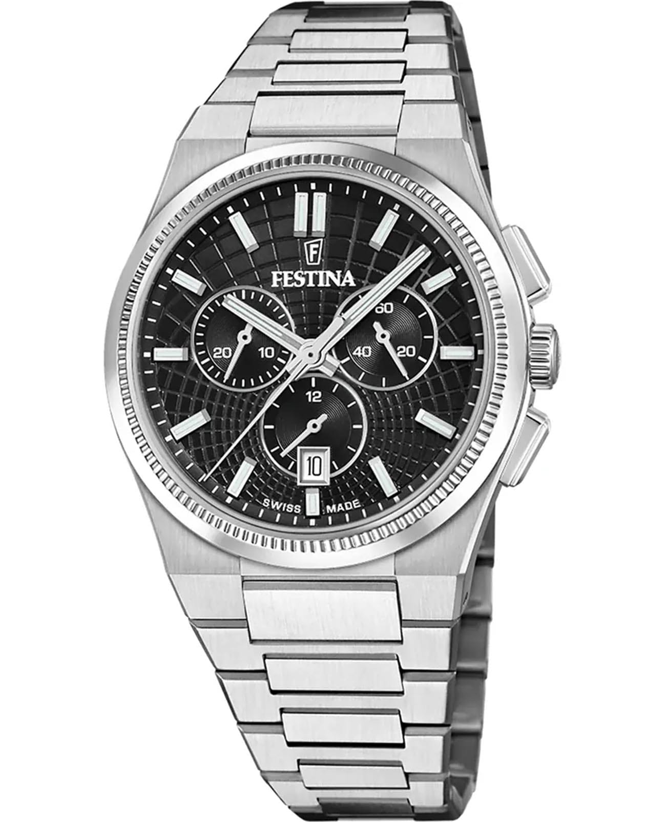 Мужские кварцевые часы Festina из коллекции Rivé — это элегантный аксессуар с швейцарским качеством и функциональным дизайном. Корпус диаметром 42,5 мм и толщиной 12 мм выполнен из нержавеющей стали серебряного цвета. Циферблат чёрного цвета дополнен малым циферблатом для секунд и окошком даты в положении 3 часов. Циферблат защищён сапфировым стекломСапфировое стеклоПрочный и надёжный материал из кристалла сапфира синтетического происхождения, характеризующийся особой твёрдостью и устойчивостью к царапинам и повреждениям.. Стрелки с люминесцентным покрытиемЛюминесцентное покрытиеПозволяет считывать показания времени в темноте. Производители наносят на стрелки, часовые индексы, безель или поверхность циферблата светонакопительный состав, дающий холодное свечение., обеспечивающим хорошую читаемость в темноте. Заводная головка — вытягивающегося типа, задняя крышка — завинчивающаяся. Часы оснащены стальным браслетом на застёжке «бабочка» с кнопкамиЗастёжка "бабочка"Такой вид застёжки дополняется предохранителями, помогающими избежать случайного раскрытия браслета. Обладают изящным исполнением. . Механизм — швейцарский кварцевый калибр Ronda 5030.D с функцией хронографаХронографФункция позволяет измерять отрезки времени с особой точностью: часы, минуты, секунды. Верным признаком хронографа является наличие на циферблате 3 дополнительных окошек-счётчиков.: центральная секундная стрелка, функции сплит и добавления времени. Срок службы батареи — 54 месяца. Водонепроницаемость 100 м позволяет использовать часы для плавания. Универсальный выбор для тех, кто ценит точность, стиль и швейцарское мастерство.