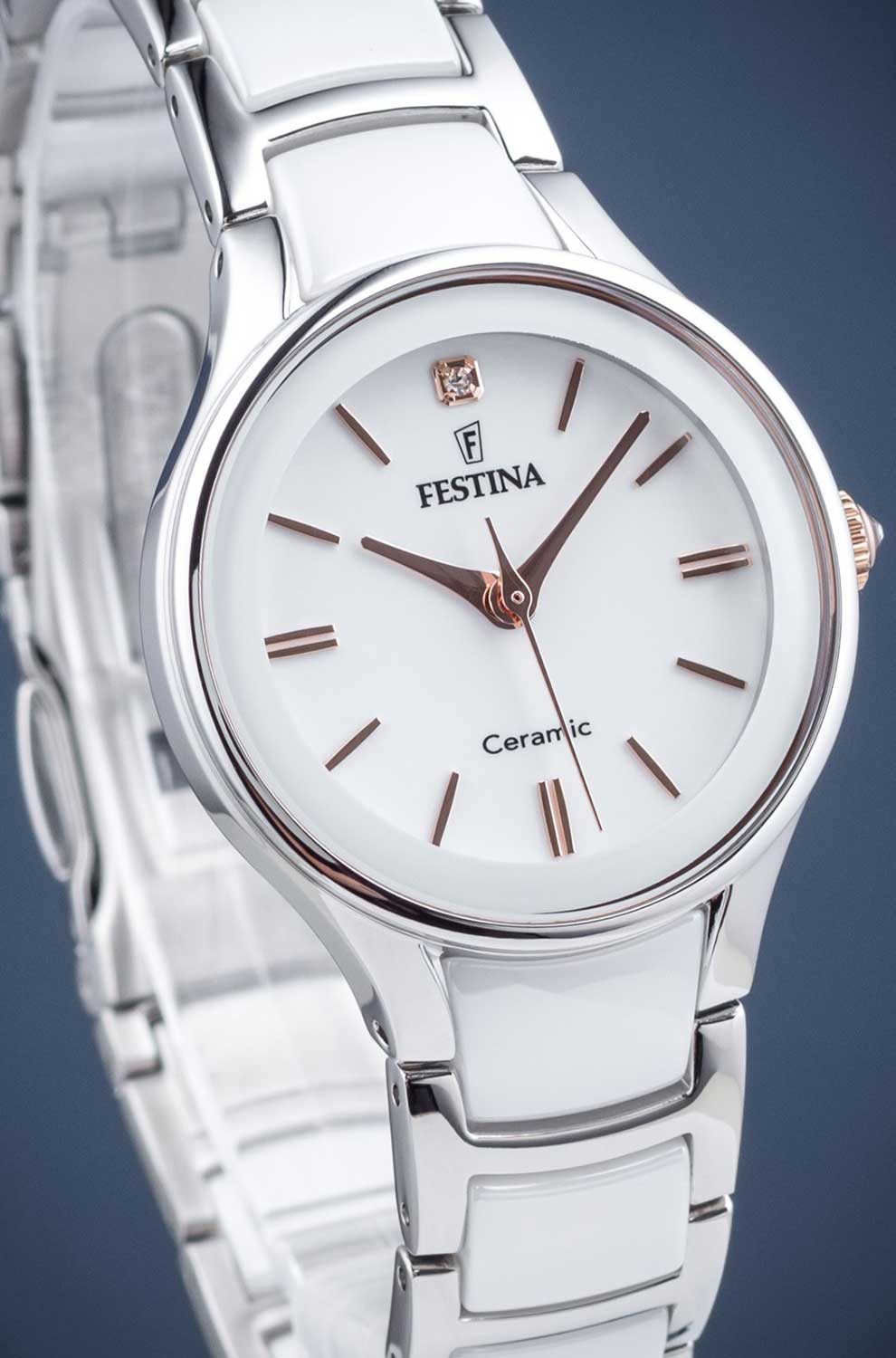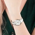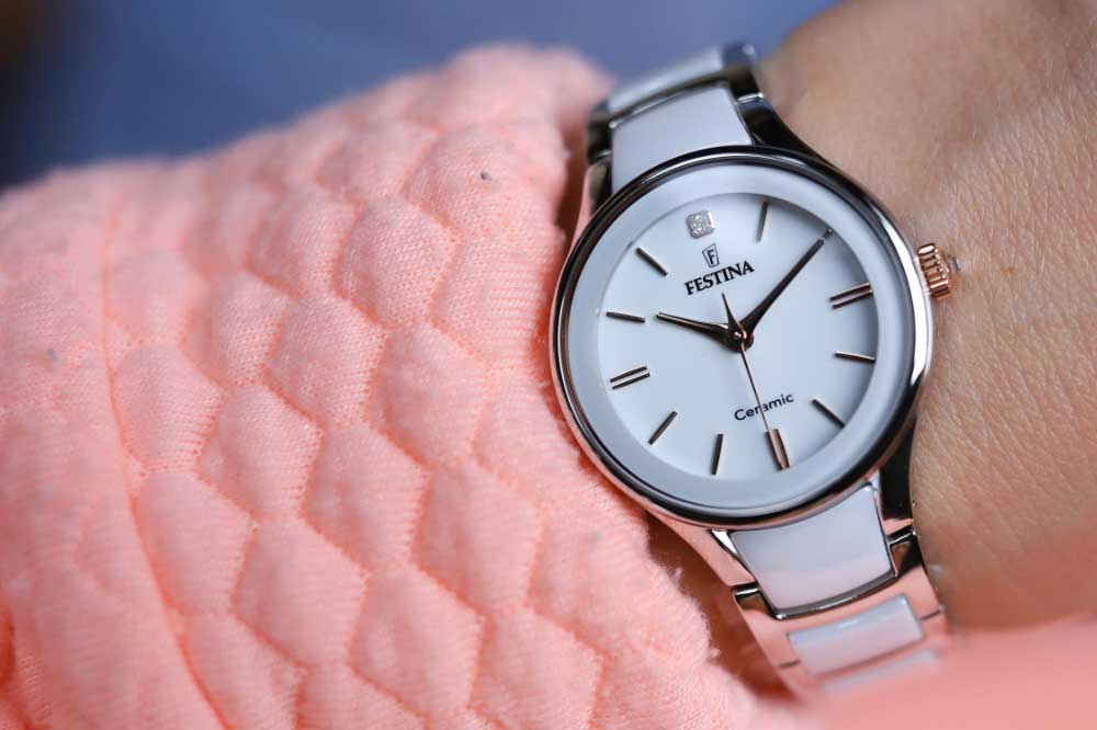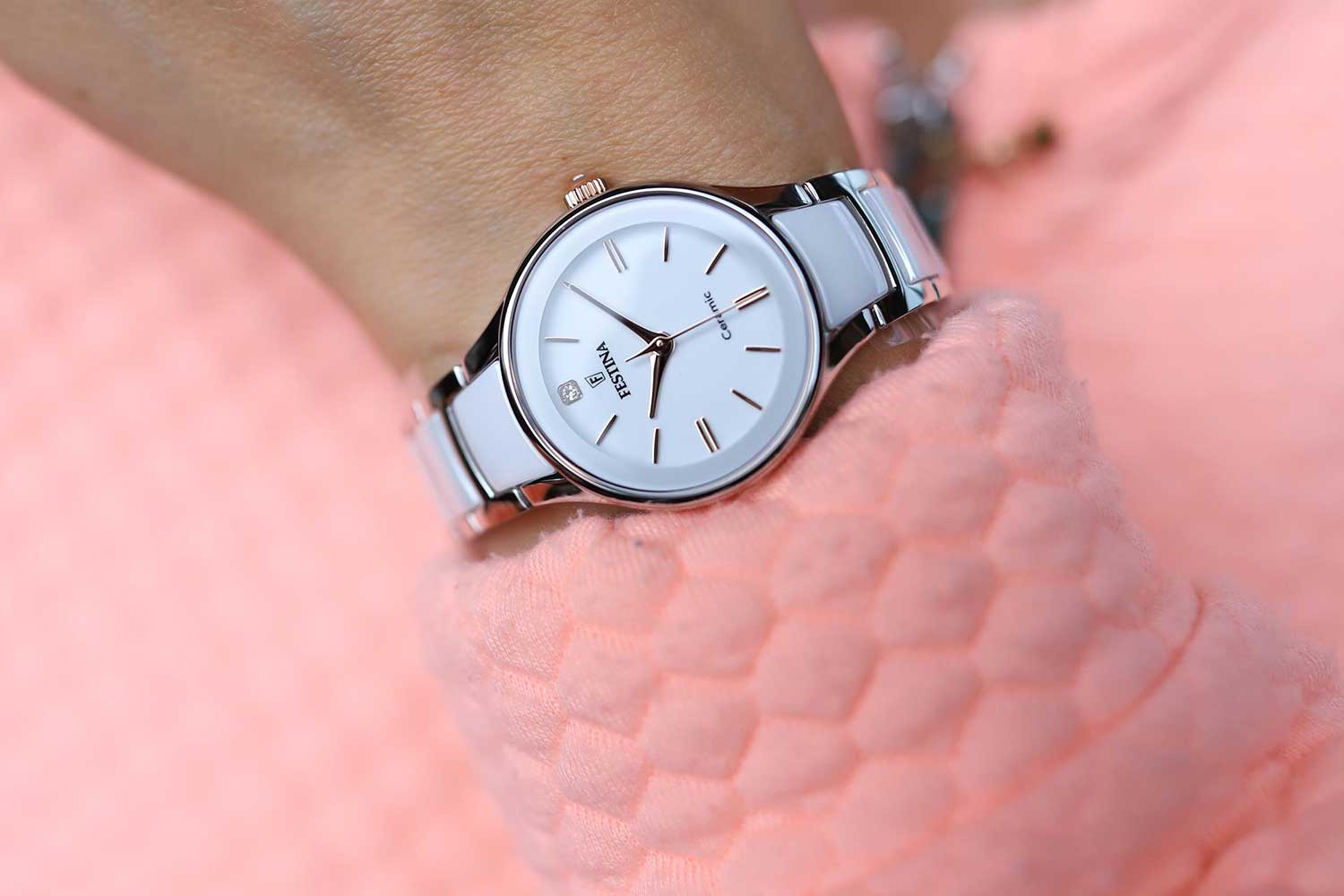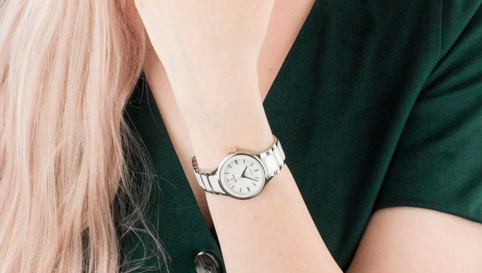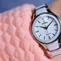 Яркий стиль и функциональность этих часов придутся по душе активной девушке. Кварцевый механизм с высокой точностью. Минеральное стеклоМинеральное стеклоМинеральное стекло представляет собой искусственно выращенный минерал кварца. Такое стекло отличается особой устойчивостью к повреждениям и царапинам. Уступает по некоторым качествам сапфировому стеклу. устойчивое к появлению царапин, обладающее высокой прозрачностью. Керамический неподвижный безельБезельВнешний ободок, закрепляющий стекло. В спортивных часах так называется поворотное кольцо с делениями на циферблате, выполняет роль таймера – замеряет отрезки времени на шкале. Неподвижный безель – элемент декора. Однонаправленно вращающийся безель на дайверских часах позволяет фиксировать моменты погружения и выныривания на поверхность.. Класс водозащиты: 50 метров, позволит защитить корпус от случайных брызг или капель дождя. Корпус часов изготовлен из нержавеющей стали. Браслет с керамическими вставками и с раскладной застёжкойРаскладная застёжкаТакой тип застёжки используется только на браслетах из металла. Она никогда не раскрывается полностью, происходит разделение на 2 и более частей. Раскладывающая застёжка снизит вероятность потери часов к минимуму..