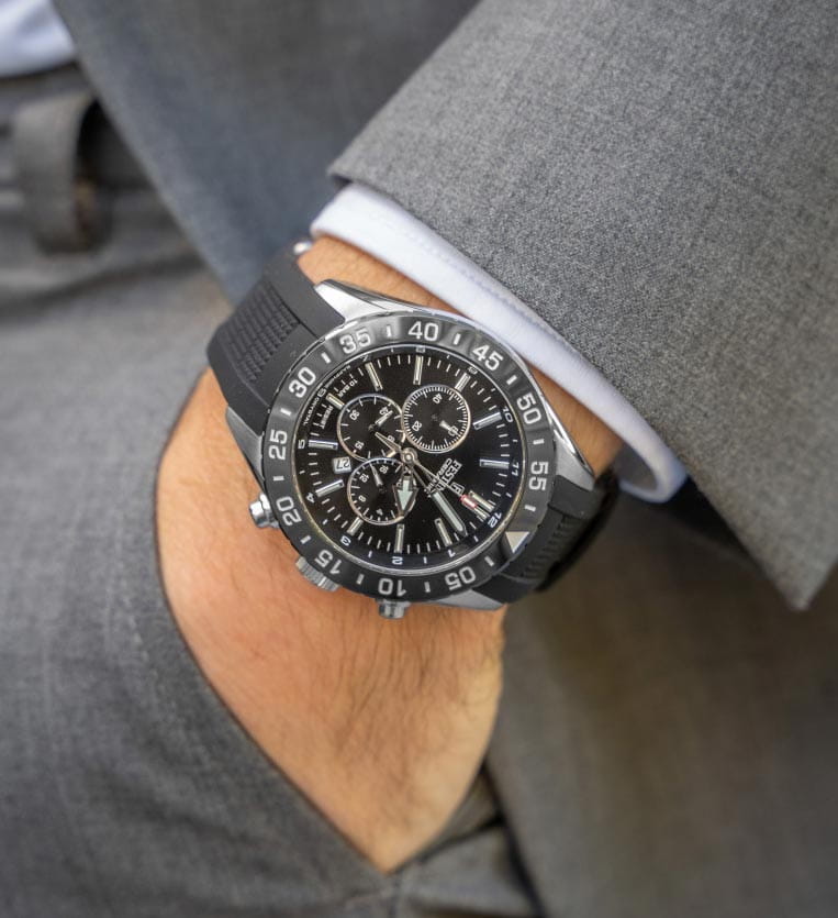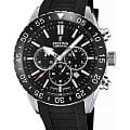 Festina F20515/2 — это современные наручные часы-хронографХронографФункция позволяет измерять отрезки времени с особой точностью: часы, минуты, секунды. Верным признаком хронографа является наличие на циферблате 3 дополнительных окошек-счётчиков. с секундомеромСекундомерСекундоме́р — прибор, способный измерять интервалы времени с точностью до долей секунды., которые сочетают стильный внешний вид и функциональность. Кварцевый механизм обеспечивает высокую точность измерения времени и простоту обслуживания. Сапфировое стеклоСапфировое стеклоПрочный и надёжный материал из кристалла сапфира синтетического происхождения, характеризующийся особой твёрдостью и устойчивостью к царапинам и повреждениям. отличается исключительной прозрачностью и высокой устойчивостью к царапинам, что сохраняет презентабельный внешний вид часов даже при активном использовании. Керамический безельБезельВнешний ободок, закрепляющий стекло. В спортивных часах так называется поворотное кольцо с делениями на циферблате, выполняет роль таймера – замеряет отрезки времени на шкале. Неподвижный безель – элемент декора. Однонаправленно вращающийся безель на дайверских часах позволяет фиксировать моменты погружения и выныривания на поверхность. придаёт модели дополнительную прочность и изысканность. Водозащита 100 метров позволяет не только плавать, но и заниматься дайвингом или другими водными видами спорта без риска для устройства. Стрелки и часовые метки с люминесцентным покрытиемЛюминесцентное покрытиеПозволяет считывать показания времени в темноте. Производители наносят на стрелки, часовые индексы, безель или поверхность циферблата светонакопительный состав, дающий холодное свечение. обеспечивают отличную видимость в темноте, также часы дополнены удобным календарем с окошком даты на позиции 4,5 часа. Корпус изготовлен из нержавеющей стали 316L, а удобный каучуковый ремешок с классической застежкой гарантирует комфортную посадку на запястье.