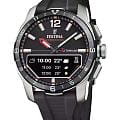 Мужские гибридные умные часы Festina Connected D — это современный аксессуар, сочетающий классический аналоговый дизайн и передовые технологии. Корпус диаметром 44 мм выполнен из лёгкого титана. БезельБезельВнешний ободок, закрепляющий стекло. В спортивных часах так называется поворотное кольцо с делениями на циферблате, выполняет роль таймера – замеряет отрезки времени на шкале. Неподвижный безель – элемент декора. Однонаправленно вращающийся безель на дайверских часах позволяет фиксировать моменты погружения и выныривания на поверхность. с IP-покрытиемIP-покрытиеМетод ионного напыления. Демонстрирует повышенную устойчивость к истиранию, окислению и химическим веществам. Под воздействием высокого давления и температуры около 1500°C молекулы металла надёжно соединяются с частицами корпуса часов.. Циферблат чёрного цвета оформлен штрихами и стрелками. В центре циферблата расположен небольшой OLED-дисплей для отображения цифровой информации. Циферблат защищён сапфировым стекломСапфировое стеклоПрочный и надёжный материал из кристалла сапфира синтетического происхождения, характеризующийся особой твёрдостью и устойчивостью к царапинам и повреждениям.. Часы оснащены функциями BluetoothBluetoothСовременная технология, позволяющая синхронизировать часы с телефоном и переносить данные. Часы с Bluetooth расширяют возможности вашего смартфона и делают его использование ещё более удобным., мирового времениМировое время Полезное часовое усложнение, отображающее время в основных городах и известных областях по всему миру, оно связано с часовыми поясами, удобно для путешественников и бизнесменов. , будильника, таймера обратного отсчёта, секундомера, а также уведомлений о звонках, сообщениях и напоминаниях. Стрелки и метки с люминесцентным покрытиемЛюминесцентное покрытиеПозволяет считывать показания времени в темноте. Производители наносят на стрелки, часовые индексы, безель или поверхность циферблата светонакопительный состав, дающий холодное свечение. обеспечивают читаемость в темноте. Часы оснащены силиконовым ремешком чёрного цвета на стандартной пряжке. Водонепроницаемость 30 м позволяет использовать часы в повседневных условиях. Идеальный выбор для тех, кто ценит стиль, точность и интеллектуальные функции.