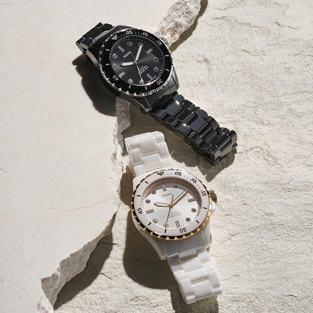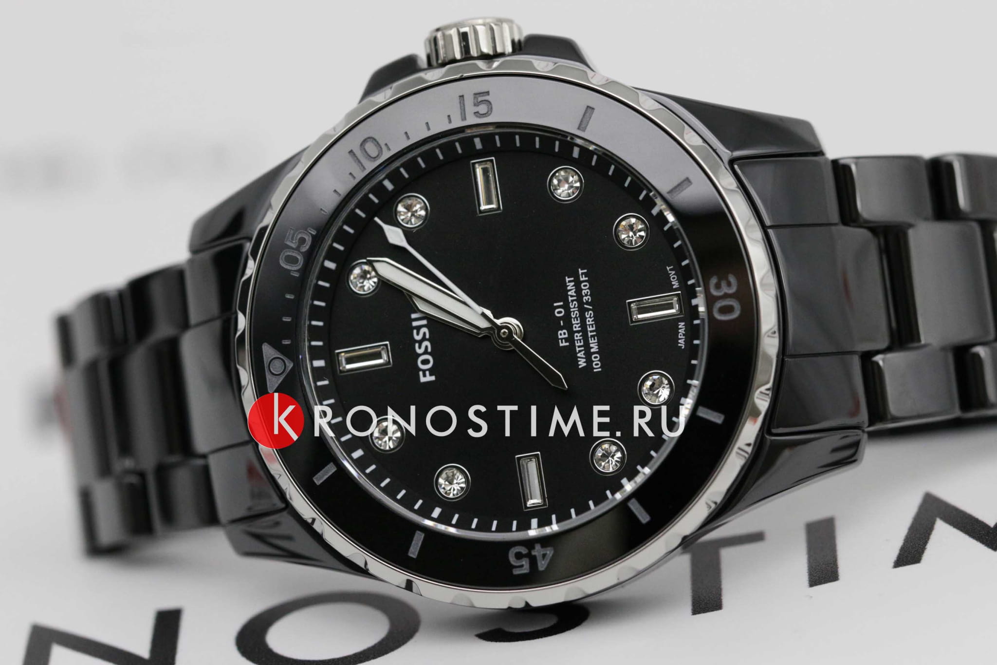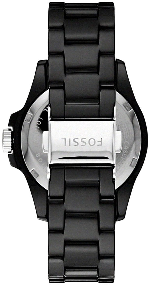 Женские наручные часы с кристаллами Fossil FB-01 CE1108, кварцевый механизм с высокой точностью. Класс водозащиты: 100 метров, позволит плавать, нырять и заниматься другими водными видами спорта. Стрелки с люминесцентным покрытиемЛюминесцентное покрытиеПозволяет считывать показания времени в темноте. Производители наносят на стрелки, часовые индексы, безель или поверхность циферблата светонакопительный состав, дающий холодное свечение.. Циферблат украшен кристаллами. Корпус часов изготовлен из стали с IP-покрытиемIP-покрытиеМетод ионного напыления. Демонстрирует повышенную устойчивость к истиранию, окислению и химическим веществам. Под воздействием высокого давления и температуры около 1500°C молекулы металла надёжно соединяются с частицами корпуса часов.. Керамический браслет с раскладной застёжкойРаскладная застёжкаТакой тип застёжки используется только на браслетах из металла. Она никогда не раскрывается полностью, происходит разделение на 2 и более частей. Раскладывающая застёжка снизит вероятность потери часов к минимуму..