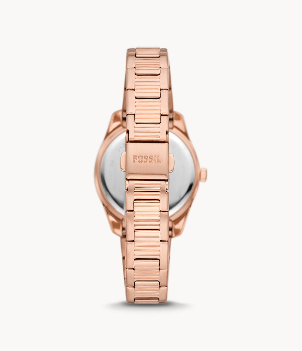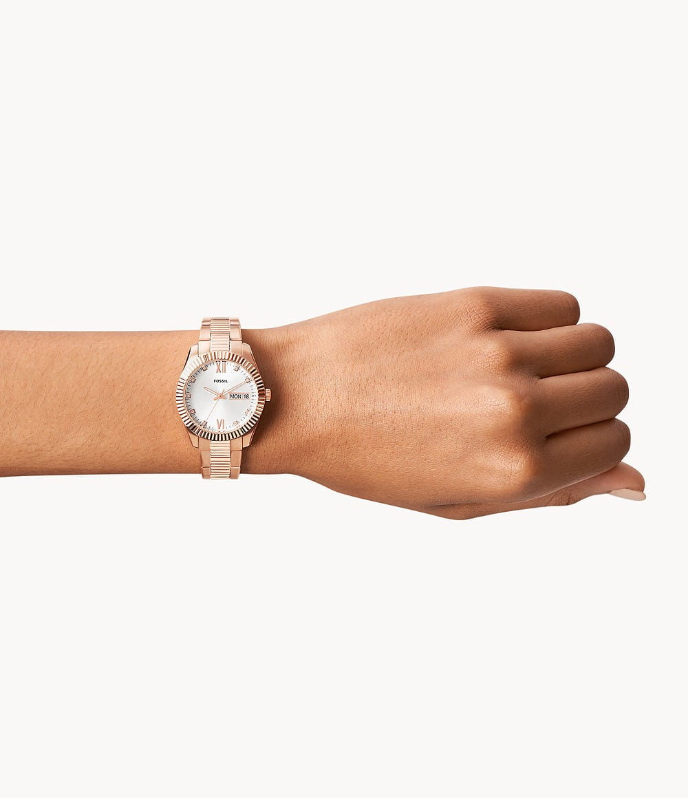 Женские американские кварцевые часы Fossil Scarlette ES5200, кварцевый механизм с высокой точностью. Класс водозащиты: 50 метров, позволит защитить корпус от случайных брызг или капель дождя. Корпус часов изготовлен из стали с IP-покрытиемIP-покрытиеМетод ионного напыления. Демонстрирует повышенную устойчивость к истиранию, окислению и химическим веществам. Под воздействием высокого давления и температуры около 1500°C молекулы металла надёжно соединяются с частицами корпуса часов.. Стальной браслет с раскладной застёжкойРаскладная застёжкаТакой тип застёжки используется только на браслетах из металла. Она никогда не раскрывается полностью, происходит разделение на 2 и более частей. Раскладывающая застёжка снизит вероятность потери часов к минимуму. с IP-покрытиемIP-покрытиеМетод ионного напыления. Демонстрирует повышенную устойчивость к истиранию, окислению и химическим веществам. Под воздействием высокого давления и температуры около 1500°C молекулы металла надёжно соединяются с частицами корпуса часов.. Окошки дня недели и даты находятся в положении 3 часа. Циферблат инкрустирован кристаллами. Стрелки с люминесцентным покрытиемЛюминесцентное покрытиеПозволяет считывать показания времени в темноте. Производители наносят на стрелки, часовые индексы, безель или поверхность циферблата светонакопительный состав, дающий холодное свечение..