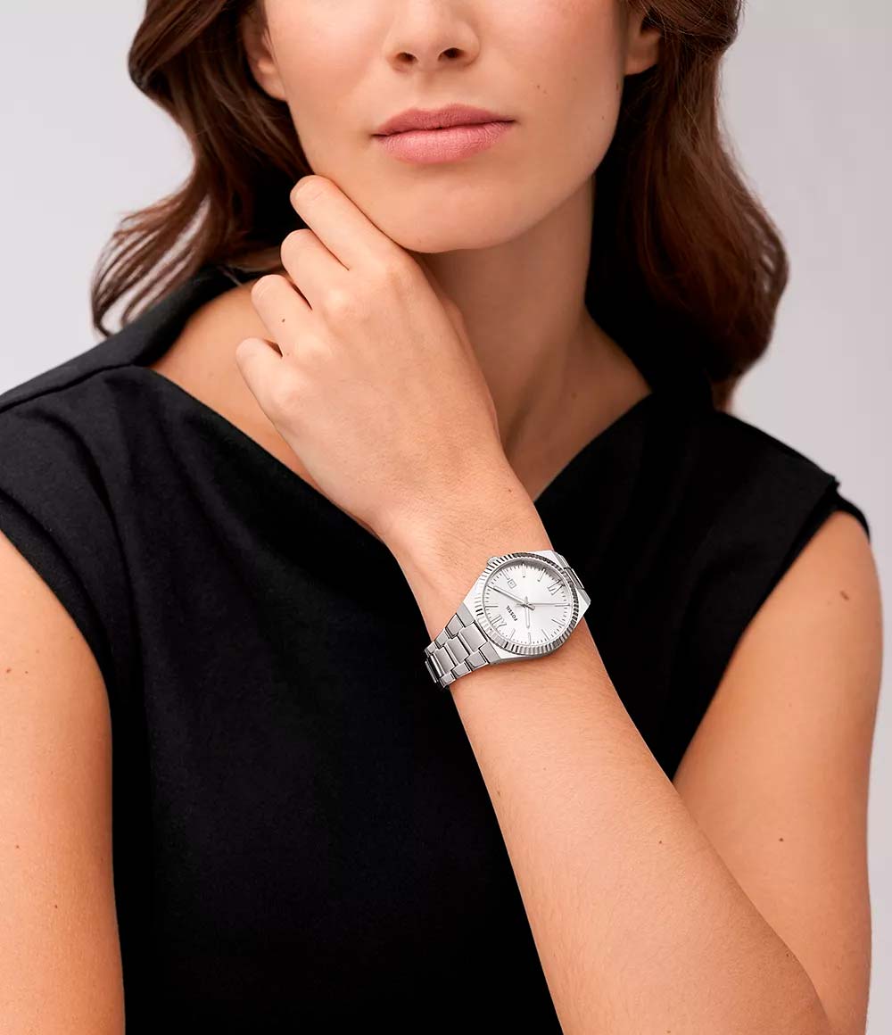 Женские американские кварцевые часы с минеральным стекломМинеральное стеклоМинеральное стекло представляет собой искусственно выращенный минерал кварца. Такое стекло отличается особой устойчивостью к повреждениям и царапинам. Уступает по некоторым качествам сапфировому стеклу. Fossil Scarlette ES5300, кварцевый механизм с высокой точностью. Класс водозащиты: 50 метров, позволит защитить корпус от случайных брызг или капель дождя. Корпус и браслет часов изготовлены из нержавеющей стали с IP-покрытиемIP-покрытиеМетод ионного напыления. Демонстрирует повышенную устойчивость к истиранию, окислению и химическим веществам. Под воздействием высокого давления и температуры около 1500°C молекулы металла надёжно соединяются с частицами корпуса часов.. Стальной браслет с раскладной застёжкойРаскладная застёжкаТакой тип застёжки используется только на браслетах из металла. Она никогда не раскрывается полностью, происходит разделение на 2 и более частей. Раскладывающая застёжка снизит вероятность потери часов к минимуму.. Окошко даты находятся в положении 3 часа. Стрелки и метки с люминесцентным покрытиемЛюминесцентное покрытиеПозволяет считывать показания времени в темноте. Производители наносят на стрелки, часовые индексы, безель или поверхность циферблата светонакопительный состав, дающий холодное свечение..