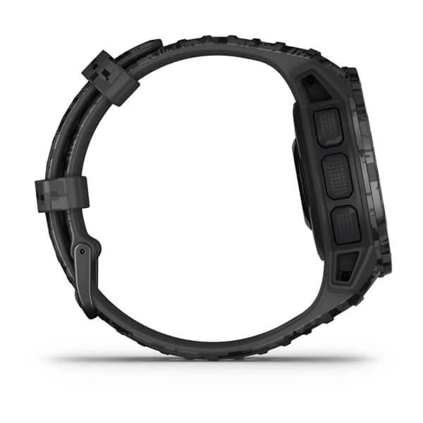 Умные многофункциональные мужские часы Garmin Instinct Solar Camo Graphite 010-02293-05, электронный механизм с высокой точностью. Класс водозащиты: 100 метров, позволит плавать, нырять и заниматься другими водными видами спорта. Материал корпуса: Фиброармированный полимер Ударопрочный корпусУдаропрочный корпусМеханизм заключён в корпус, выполненный из современных материалов, устойчивых к ударам, механическим повреждениям и падению с высоты: инновационный пластик, карбон, нержавеющая сталь, титан.. Минеральное стеклоМинеральное стеклоМинеральное стекло представляет собой искусственно выращенный минерал кварца. Такое стекло отличается особой устойчивостью к повреждениям и царапинам. Уступает по некоторым качествам сапфировому стеклу. которое было химически усиленно. Экран с светодиодной подсветкойСветодиодная подсветкаСветодиодная или LED-подсветка обеспечивает появление яркого холодного свечения за счёт LED-элементов - маленьких лампочек. Они потребляют минимальное количество энергии, чаще всего можно встретить 1 светодиод, в нижней части циферблата..