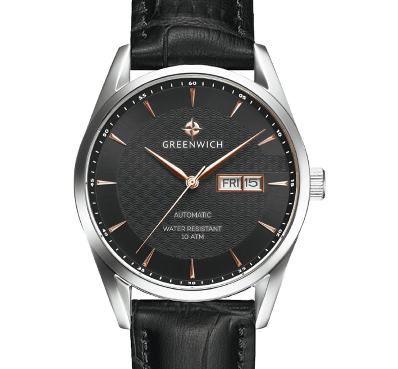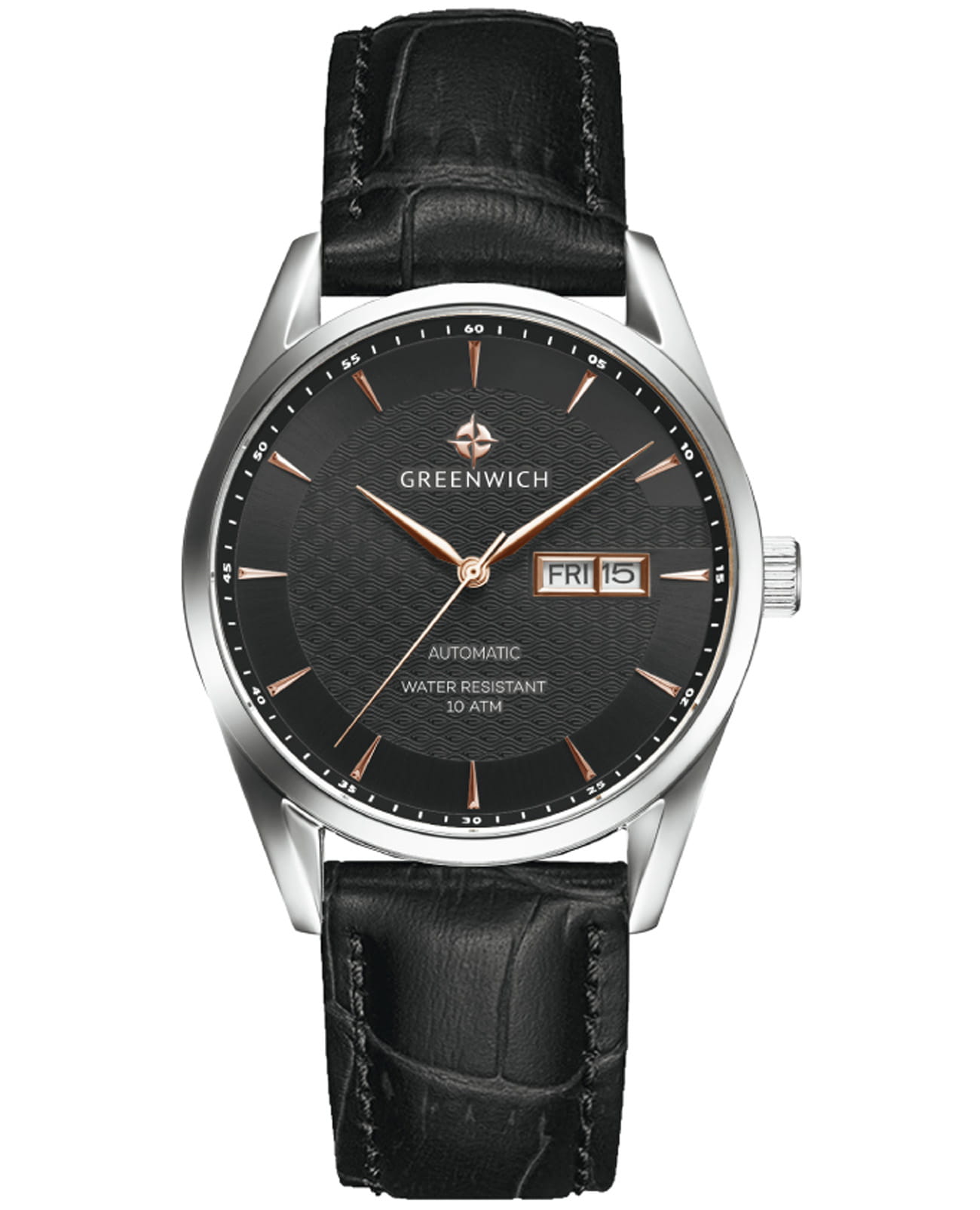Мужские часы с минеральным стекломМинеральное стеклоМинеральное стекло представляет собой искусственно выращенный минерал кварца. Такое стекло отличается особой устойчивостью к повреждениям и царапинам. Уступает по некоторым качествам сапфировому стеклу. Greenwich Good Luck Classic GW 074.11.35, представляют собой классический вариант для повседневной носки. В центральной части циферблата — отличительная черта моделей этой серии: гильоше, объемные линии которого напоминают волны. Обратите внимание на форму пластины, где крепятся накладные риски: она сделана в форме латинской буквы G, первой буквы в названии бренда. Часы характеризуются традиционными формами, лаконичным исполнением, что делает модель элегантным дополнением к деловому костюму. Сквозь прозрачную заднюю крышку вы увидите детали механизма TMI с декорированным ротором: на нем выгравировано изображение символа английских моряков — парусника. Ремешок выполнен из натуральной кожи с прошивкой в тон. Дизайн, актуальный для любого современного образа, и надежность используемых материалов делают автоматические часы Greenwich удобным и стильным аксессуаром на каждый день. Окошко даты и дня недели находится в положении 3 часа. Класс водозащиты: 100 метров, позволит плавать, нырять и заниматься другими водными видами спорта.