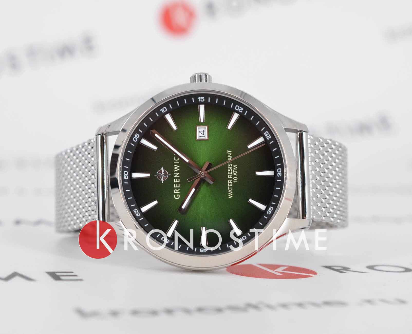 Часы Greenwich Helm GW 041.19.39— это стильная и надежная модель, сочетающая современные технологии и элегантный дизайн. Корпус часов выполнен из прочной гипоаллергенной нержавеющей стали с особой вертикальной матовой полировкой на боковой части, что придает корпусу визуальную тонкость и индивидуальность. Диаметр корпуса составляет 42 мм — оптимальный размер для повседневного использования. Внутри установлен надежный японский кварцевый механизм Miyota, который обеспечивает точность хода и долговечность. Зеленый циферблат часов отличается глубиной и объемом благодаря оригинальному внутреннему «колодцу» с нанесенной секундной разметкой. Полировка в стиле солнечных лучей придает поверхности изысканный блеск. Индексы в виде трапеций изготовлены вручную и закреплены на двух штифтах, а для удобства чтения времени в темноте на стрелки и индексы нанесено люминесцентное покрытиеЛюминесцентное покрытиеПозволяет считывать показания времени в темноте. Производители наносят на стрелки, часовые индексы, безель или поверхность циферблата светонакопительный состав, дающий холодное свечение.. Часовая и минутная стрелки имеют мечеобразную форму, что делает их визуально выразительными и легко читаемыми. Циферблат защищен прочным минеральным стекломМинеральное стеклоМинеральное стекло представляет собой искусственно выращенный минерал кварца. Такое стекло отличается особой устойчивостью к повреждениям и царапинам. Уступает по некоторым качествам сапфировому стеклу.. Водонепроницаемость модели составляет 10 ATM, что позволяет использовать часы во время занятий водными видами спорта. Завинчивающаяся задняя крышка обеспечивает дополнительную защиту от влаги. Часы оснащены литым металлическим браслетом с миланским плетением, который надежно фиксируется с помощью раскладного замкаРаскладной замокДанный вариант застежки используется только на часах с металлическим браслетом. Отличительная особенность такого крепления в том, что длина браслета становится универсальной и вы можете самостоятельно отрегулировать нужный вам размер – застежка просто двигается по браслету часов., предотвращающей случайное раскрытие. На циферблате и заводной головке размещён фирменный логотип марки — изображение «розы ветров», символизирующее удачу и новые открытия. Задняя крышка украшена гравировкой с изображением «розы ветров» и корабля, подчеркивающих морскую тематику бренда Greenwich.