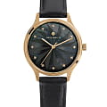 Женские английские кварцевые часы с минеральным стекломМинеральное стеклоМинеральное стекло представляет собой искусственно выращенный минерал кварца. Такое стекло отличается особой устойчивостью к повреждениям и царапинам. Уступает по некоторым качествам сапфировому стеклу. Greenwich Callisto GW 341.41.51, кварцевый механизм с высокой точностью. Класс водозащиты: 50 метров, позволит защитить корпус от случайных брызг или капель дождя. Корпус часов изготовлен из стали с PVD-покрытиемPVDУльтратонкое покрытие наносится в технике вакуумного напыления, сочетает в себе нитрид титана особой прочности со слоем золота или оксида хрома. Несёт в себе декоративную или защитную функцию.. Кожаный ремешок на стандартной застёжке. Циферблат выполнен из натурального перламутра черного цвета с эффектной гравировкой: она напоминает звезду, сияющую на ночном небе. Фианиты надежно закреплены в кастах. Кварцевый механизм Miyota отвечает за точный ход стрелок: часовой, минутной и секундной.