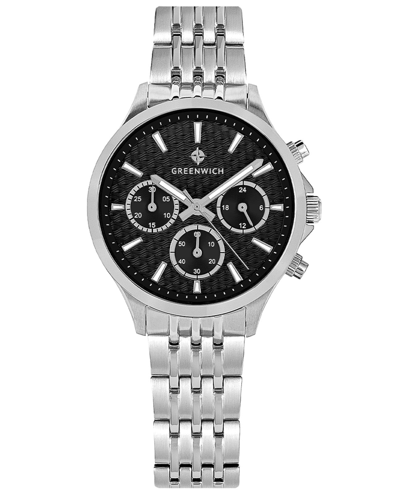 Женские кварцевые часы Greenwich — это сочетание элегантности и функциональности. Корпус диаметром 35 мм выполнен из нержавеющей стали. Циферблат чёрного цвета оформлен с эффектом гильоше в виде волнообразных линий, придающим ему объём и глубину. На циферблате расположены субциферблаты хронографа (секундомер на 60 секунд и 30 минут) и индикатор 24-часового формата. Окошко даты находится в положении 3 часов. Все индикаторы выделены рамками с зеркальной полировкой. Стрелки и метки с люминесцентным покрытиемЛюминесцентное покрытиеПозволяет считывать показания времени в темноте. Производители наносят на стрелки, часовые индексы, безель или поверхность циферблата светонакопительный состав, дающий холодное свечение., обеспечивающим хорошую читаемость в темноте. Циферблат защищён минеральным стекломМинеральное стеклоМинеральное стекло представляет собой искусственно выращенный минерал кварца. Такое стекло отличается особой устойчивостью к повреждениям и царапинам. Уступает по некоторым качествам сапфировому стеклу.. Механизм — кварцевый калибр Miyota с функцией хронографа. Часы оснащены стальным браслетом с комбинированной полировкой (матовые и зеркальные звенья) и удобной раскладной застёжкойРаскладная застёжкаТакой тип застёжки используется только на браслетах из металла. Она никогда не раскрывается полностью, происходит разделение на 2 и более частей. Раскладывающая застёжка снизит вероятность потери часов к минимуму.. Водонепроницаемость 100 м позволяет использовать часы для плавания и повседневного ношения. Гарантия — 24 месяца. Идеальный выбор для тех, кто ценит стиль, точность и надёжность.