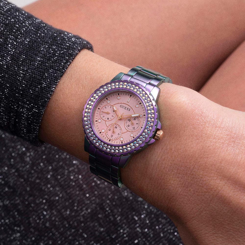 Женские наручные часы Guess Sport Steel GW0410L4 с минеральным стекломМинеральное стеклоМинеральное стекло представляет собой искусственно выращенный минерал кварца. Такое стекло отличается особой устойчивостью к повреждениям и царапинам. Уступает по некоторым качествам сапфировому стеклу., кварцевый механизм с высокой точностью. 12-ти и 24-х часовой формат времени, число и день недели вынесены на отдельные циферблаты. Метки в виде точек. Класс водозащиты: 30 метров, позволит защитить корпус от случайных брызг или капель дождя. Корпус часов изготовлен из стали с IP-покрытиемIP-покрытиеМетод ионного напыления. Демонстрирует повышенную устойчивость к истиранию, окислению и химическим веществам. Под воздействием высокого давления и температуры около 1500°C молекулы металла надёжно соединяются с частицами корпуса часов.. Браслет с раскладной застёжкойРаскладная застёжкаТакой тип застёжки используется только на браслетах из металла. Она никогда не раскрывается полностью, происходит разделение на 2 и более частей. Раскладывающая застёжка снизит вероятность потери часов к минимуму..