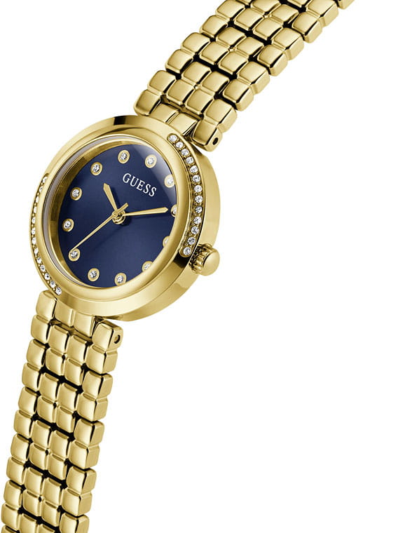 Элегантные женские наручные часы Guess GW0930L4 сочетают в себе стиль и функциональность. Эти часы оснащены точным кварцевым механизмом, что гарантирует надежность и долговечность. Корпус часов выполнен из прочной нержавеющей стали с PVD-покрытиемPVDУльтратонкое покрытие наносится в технике вакуумного напыления, сочетает в себе нитрид титана особой прочности со слоем золота или оксида хрома. Несёт в себе декоративную или защитную функцию. золотистого цвета, диаметром 28 мм, а безельБезельВнешний ободок, закрепляющий стекло. В спортивных часах так называется поворотное кольцо с делениями на циферблате, выполняет роль таймера – замеряет отрезки времени на шкале. Неподвижный безель – элемент декора. Однонаправленно вращающийся безель на дайверских часах позволяет фиксировать моменты погружения и выныривания на поверхность. украшен изысканными кристаллами, придающими им роскошный вид. Циферблат добавляет изделию утонченности и особого шарма. Часы оснащены стальным браслетом с PVD-покрытиемPVDУльтратонкое покрытие наносится в технике вакуумного напыления, сочетает в себе нитрид титана особой прочности со слоем золота или оксида хрома. Несёт в себе декоративную или защитную функцию. на раскладной застёжкеРаскладная застёжкаТакой тип застёжки используется только на браслетах из металла. Она никогда не раскрывается полностью, происходит разделение на 2 и более частей. Раскладывающая застёжка снизит вероятность потери часов к минимуму., которая обеспечивает комфортное прилегание к запястью и надежную фиксацию. Минеральное стеклоМинеральное стеклоМинеральное стекло представляет собой искусственно выращенный минерал кварца. Такое стекло отличается особой устойчивостью к повреждениям и царапинам. Уступает по некоторым качествам сапфировому стеклу. защищает циферблат от царапин и повреждений, сохраняя его безупречный вид. Водозащита 30WR гарантирует защиту от случайных брызг и дождя, что делает эти часы практичным аксессуаром для повседневной жизни. Guess – это не просто аксессуар, это заявление о вашем безупречном вкусе и стремлении к совершенству.