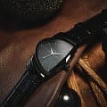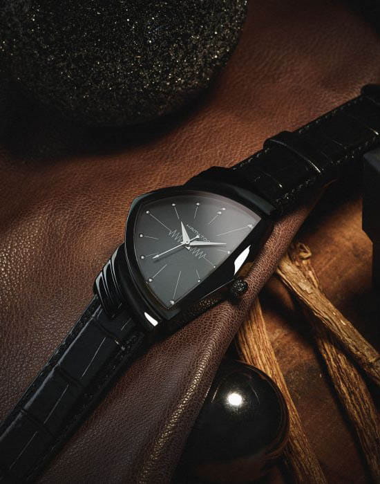 Чёрный циферблат оформлен в минималистичном стиле: фирменный узор в виде электрического импульса отсылает к первым электронным часам Ventura. Метки и стрелки лаконичны и элегантны.