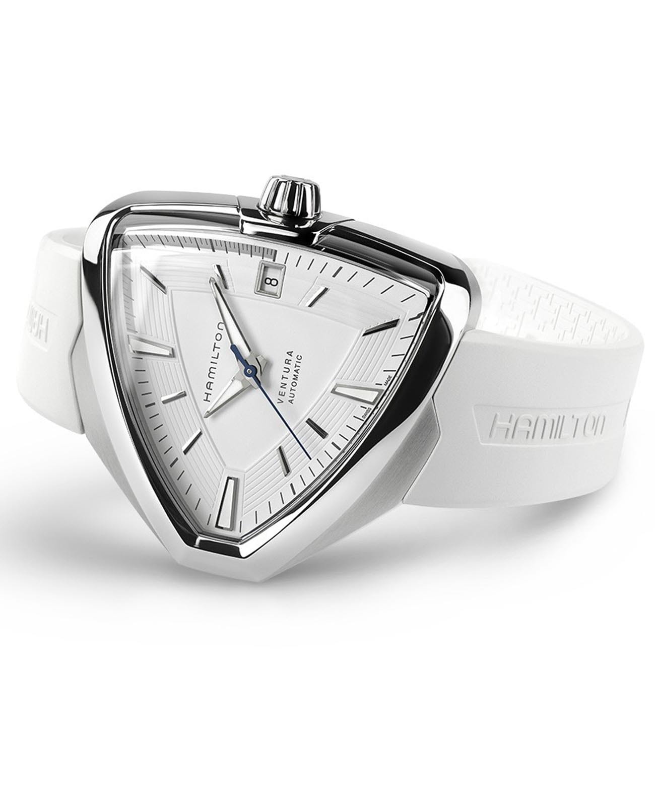 Мужские наручные часы Hamilton Ventura Elvis80 Auto H24505311 с надёжным автоматическим механизмом. Корпус часов изготовлен из нержавеющей стали. Практичный каучуковый ремешок на стандартной застёжке. Сапфировое стеклоСапфировое стеклоПрочный и надёжный материал из кристалла сапфира синтетического происхождения, характеризующийся особой твёрдостью и устойчивостью к царапинам и повреждениям. устойчивое к мелким механическим повреждениям. Класс водозащиты: 50 метров, позволит защитить корпус от случайных брызг или капель дождя. Стрелки и метки с люминесцентным покрытиемЛюминесцентное покрытиеПозволяет считывать показания времени в темноте. Производители наносят на стрелки, часовые индексы, безель или поверхность циферблата светонакопительный состав, дающий холодное свечение.. Окошко даты находится в положении 3 часа.