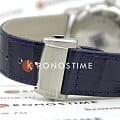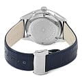 Водозащита 50 метров (5 бар) позволяет использовать часы в условиях повышенной влажности, защищая их от брызг и дождя. Кожаный ремешок синего цвета с раскладной застёжкой обеспечивает комфортное ношение и надёжную фиксацию на запястье.