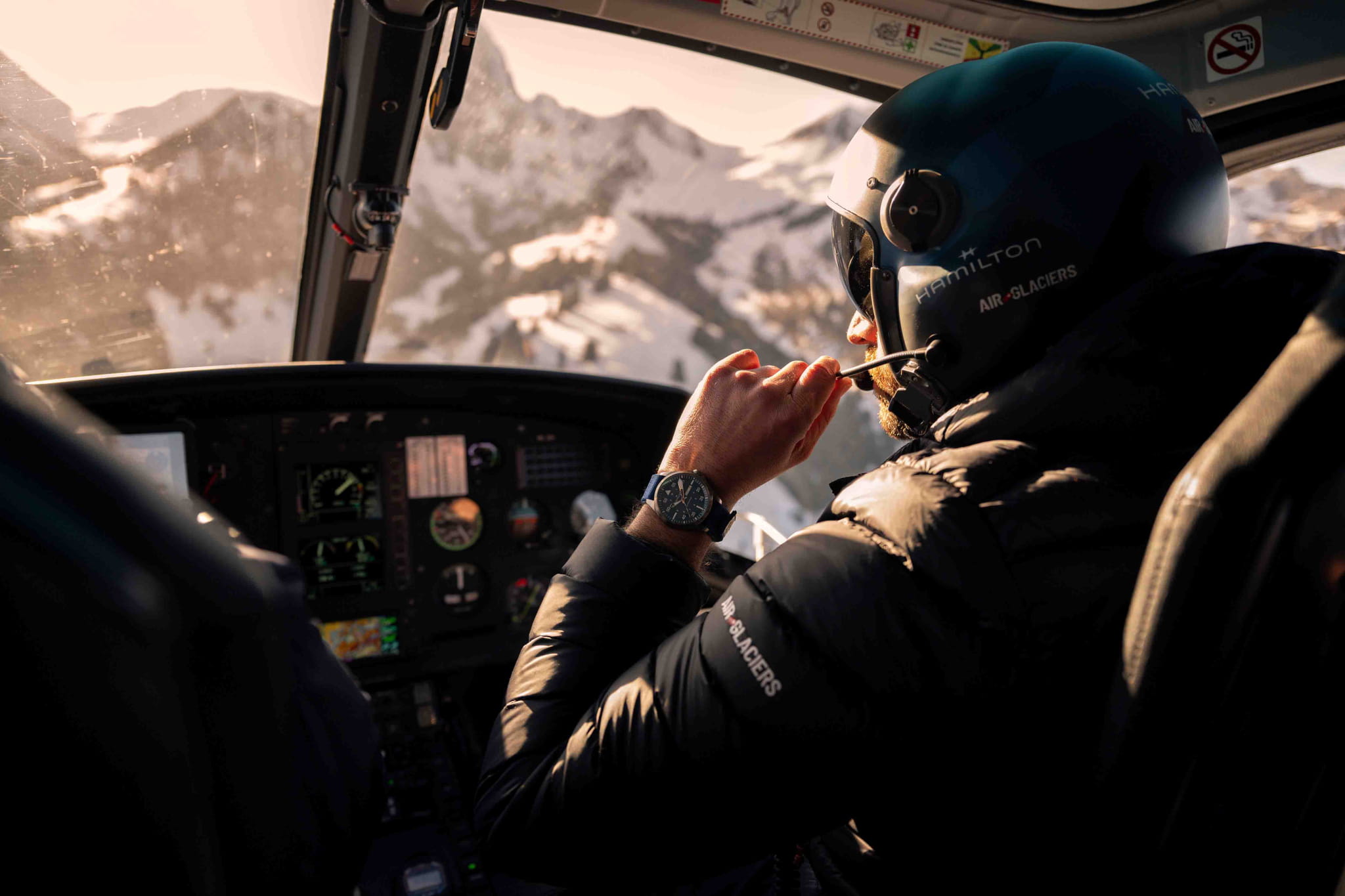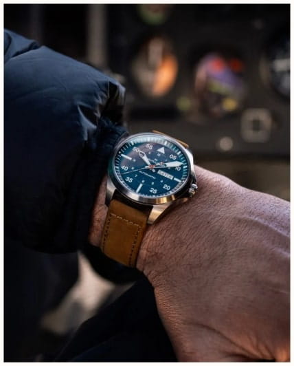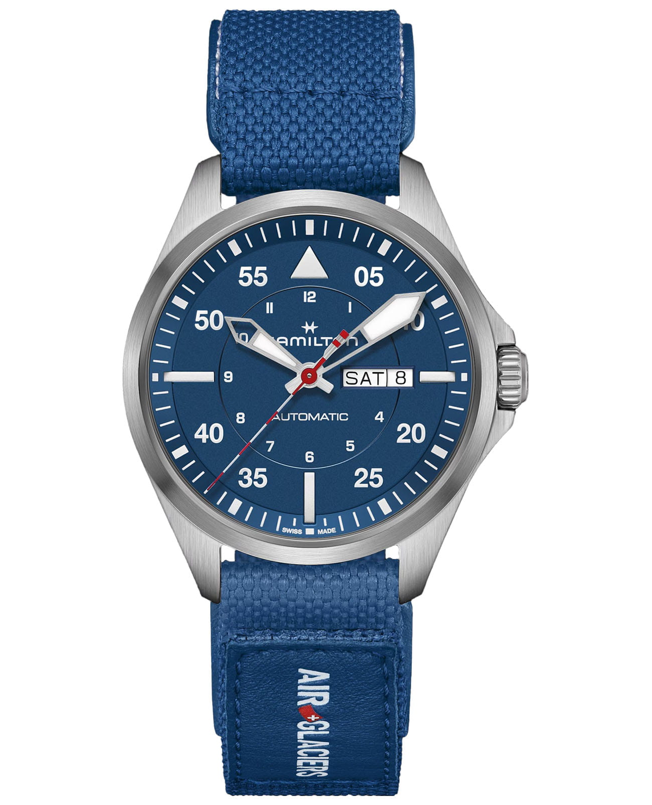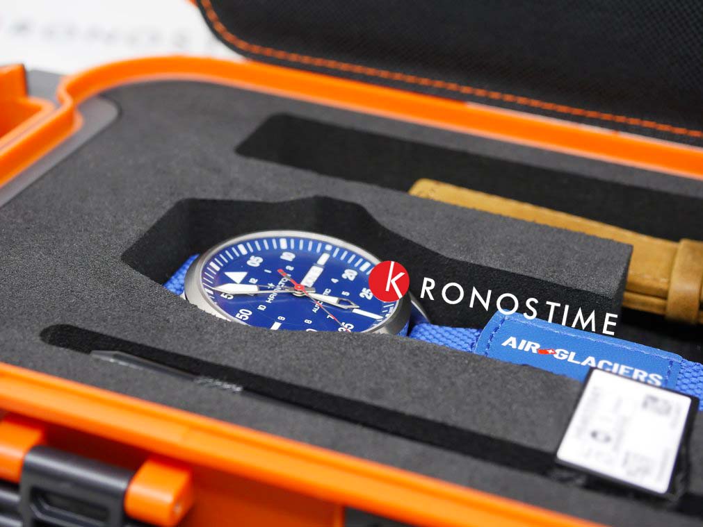 Часы специальной серии Khaki Aviation Pilot посвящены сотрудничеству со швейцарской спасательной вертолетной службой Air-Glaciers. Модель в гипоаллергенном легком корпусе из титана диаметром 42 мм, дополненная синим циферблатом, соединяет долговечность и комфорт. Готовые к любым испытаниям часы сочетают в себе культовый автоматический механизм H-30, 80-часовой запас хода и ремешок с кожаной подкладкой, внешней частью из нейлона и застежкой Velcro, обеспечивающий возможность персонализации. Изделие поставляется в специальной упаковке Pelicase с запасным сменным ремешком из коричневой замши.