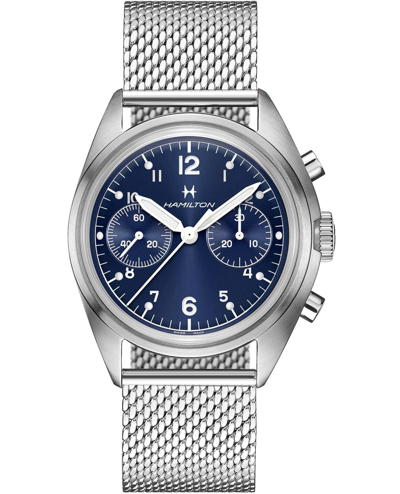 Мужские стильные швейцарские часы Hamilton Khaki Aviation Pilot Pioneer Mechanical Chronograph 40mm H76409140. Стальной корпус диаметром 40 мм и увеличенной толщиной 14,35 мм подчеркивает брутальность модели, а сапфировое стеклоСапфировое стеклоПрочный и надёжный материал из кристалла сапфира синтетического происхождения, характеризующийся особой твёрдостью и устойчивостью к царапинам и повреждениям. с антибликовым покрытиемАнтибликовое покрытиеСлой оксида металла в 0,13-0,3 микрон, благодаря которому стекло часов не бликует и не отражает свет. Антибликовое покрытие уменьшает отражение света в 10 раз, обеспечивая отличную читаемость показателей циферблата. обеспечивает превосходную читаемость матового синего циферблата со стрелками с люминесцентным покрытиемЛюминесцентное покрытиеПозволяет считывать показания времени в темноте. Производители наносят на стрелки, часовые индексы, безель или поверхность циферблата светонакопительный состав, дающий холодное свечение. Super-LumiNova®. Модель оснащена функцией хронографаХронографФункция позволяет измерять отрезки времени с особой точностью: часы, минуты, секунды. Верным признаком хронографа является наличие на циферблате 3 дополнительных окошек-счётчиков.. Механизм с ручным заводом H-51 оснащен кремниевой спиралью, обеспечивающей запас хода 60 часов и устойчивость к магнитным полям. Модель укомплектована браслетом миланского плетения из нержавеющей стали с раскладным замкомРаскладной замокДанный вариант застежки используется только на часах с металлическим браслетом. Отличительная особенность такого крепления в том, что длина браслета становится универсальной и вы можете самостоятельно отрегулировать нужный вам размер – застежка просто двигается по браслету часов., обеспечивающий надёжную посадку. Водонепроницаемость часов достигает 10 атмосфер (100 метров), делающая их подходящими для повседневного использования и активного отдыха. Это сочетание высокой прочности, точности и изысканного дизайна для уверенных в себе мужчин.