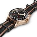 Мужские швейцарские часы Hamilton Khaki Navy Scuba Automatic GMT H82565930 сочетают функциональность путешественника с морской эстетикой, представленные в бронзовом корпусе диаметром 43 мм с титановой задней крышкой, который со временем приобретает уникальную патину. Модель оснащена автоматическим механизмом Hamilton Calibre H-14 с запасом хода 80 часов, функцией GMT (второй часовой пояс) с красной стрелкой и датой. Черный циферблат с люминесцентными индексами Super-LumiNova®Люминесцентное покрытиеПозволяет считывать показания времени в темноте. Производители наносят на стрелки, часовые индексы, безель или поверхность циферблата светонакопительный состав, дающий холодное свечение. и стрелками обеспечивает отличную читаемость в темноте, защищен сапфировым стекломСапфировое стеклоПрочный и надёжный материал из кристалла сапфира синтетического происхождения, характеризующийся особой твёрдостью и устойчивостью к царапинам и повреждениям. с антибликовым покрытием. Водонепроницаемость 30 бар (300 метров) и завинчивающаяся заводная головка делают часы надежными для дайвинга и активного отдыха. Комплектуется черно-золотистым ремешком NATO из ткани с классической застежкой, подчеркивающим стиль милитари. В набор входит фирменная коробка, гарантия 2 года и технология Nivachron™Nivachron™Специально разработанный инновационный сплав Nivachron™ повышает устойчивость часов к воздействию магнитных полей. для защиты от магнитных полей. Часы идеальны для путешественников, сочетая точность, устойчивость к экстремальным условиям и винтажный шарм бронзового корпуса.