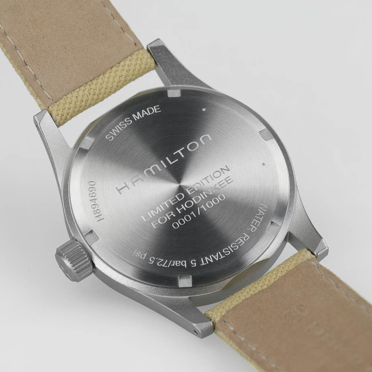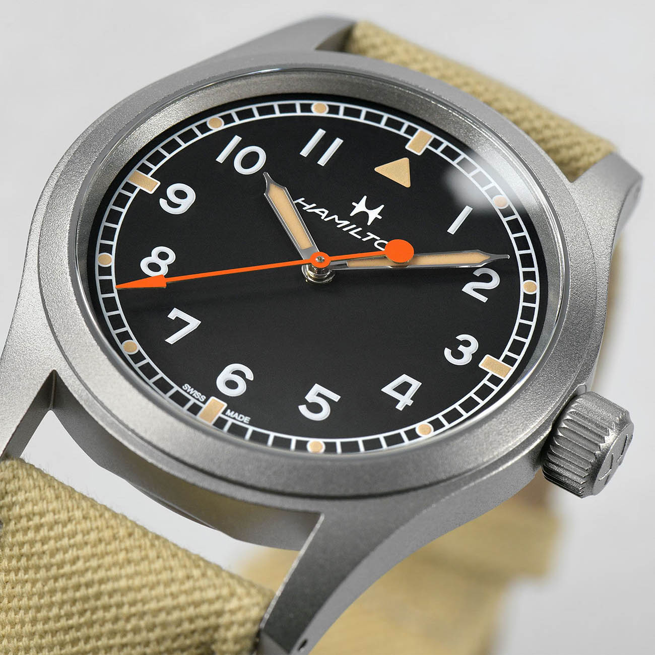 Часы Hamilton Khaki Field Mechanical Limited Edition H89469930 на холщовом ремешке и корпусом из нержавеющей стали диаметром 38 мм с пескоструйной матовой отделкой воспроизводит аутентичный военный дизайн, дополненный сапфировым стекломСапфировое стеклоПрочный и надёжный материал из кристалла сапфира синтетического происхождения, характеризующийся особой твёрдостью и устойчивостью к царапинам и повреждениям. для защиты от царапин и завинчивающейся заводной головкой, обеспечивающей водонепроницаемость до 50 метров. Стрелки с кремово-белым цветом и люминесцентным покрытиемЛюминесцентное покрытиеПозволяет считывать показания времени в темноте. Производители наносят на стрелки, часовые индексы, безель или поверхность циферблата светонакопительный состав, дающий холодное свечение. создают винтажный стиль, а ярко-оранжевая секундная стрелка добавляет контраст. Механизм с ручным заводом H-50 обеспечивает 80-часовой запас хода и оснащён спиралью баланса Nivachron™Nivachron™Специально разработанный инновационный сплав Nivachron™ повышает устойчивость часов к воздействию магнитных полей.. Задняя крышка украшена гравировкой «Limited Edition For Hodinkee» и индивидуальным номером экземпляра, а комплектация включает холщовый ремешок военного стиля со стандартной застёжкой.