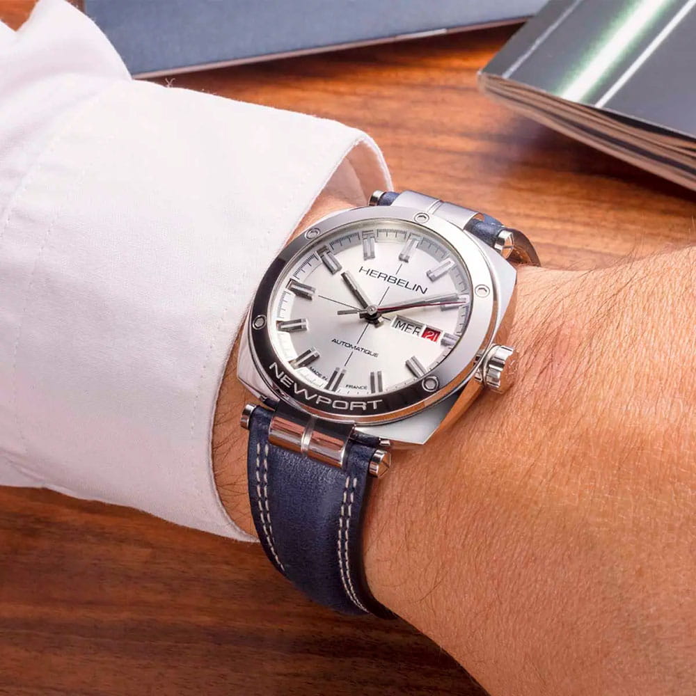 Мужские механические часы с автоподзаводом Herbelin Newport 1764AP11BL – отражающий идеальное сочетание современного дизайна, надёжности и функциональности. Элегантный облик станет превосходным завершением образа, наделив его индивидуальным характером. Корпус из нержавеющей стали серебристого цвета, диаметром 42 мм, идеально сбалансирован и элегантен. Сапфировое стеклоСапфировое стеклоПрочный и надёжный материал из кристалла сапфира синтетического происхождения, характеризующийся особой твёрдостью и устойчивостью к царапинам и повреждениям. защищает циферблат от царапин и устойчивое к механическим повреждениям. БезельБезельВнешний ободок, закрепляющий стекло. В спортивных часах так называется поворотное кольцо с делениями на циферблате, выполняет роль таймера – замеряет отрезки времени на шкале. Неподвижный безель – элемент декора. Однонаправленно вращающийся безель на дайверских часах позволяет фиксировать моменты погружения и выныривания на поверхность. украшен винтами, заводная головка с защитой. Окошко даты находится в положении 3 часа. Стрелки и метки с люминесцентным покрытиемЛюминесцентное покрытиеПозволяет считывать показания времени в темноте. Производители наносят на стрелки, часовые индексы, безель или поверхность циферблата светонакопительный состав, дающий холодное свечение.. Кожаный ремешок на стандартной застежке обеспечивает комфортное ношение. Водозащита 100 метров позволит плавать, нырять и заниматься другими водными видами спорта. Эта модель – отличный выбор для тех, кто ищет сочетание стиля, качества и функциональности. Часы станут не только полезным аксессуаром, но и выразительным элементом вашего имиджа.