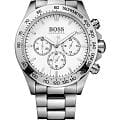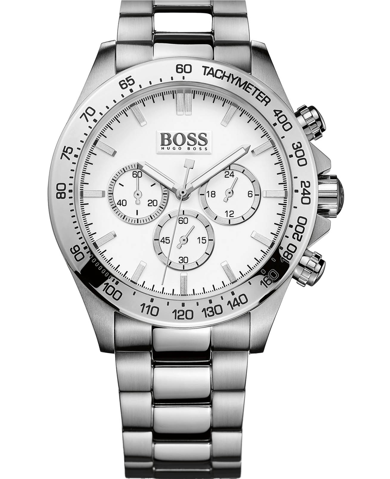Мужские часы Hugo Boss Ikon HB1512962 представлены в строгом круглом корпусе из нержавеющей стали диаметром 44 мм с матовой отделкой, защищенным прочным минеральным стекломМинеральное стеклоМинеральное стекло представляет собой искусственно выращенный минерал кварца. Такое стекло отличается особой устойчивостью к повреждениям и царапинам. Уступает по некоторым качествам сапфировому стеклу.. Модель оснащена точным кварцевым механизмом с функцией хронографаХронографФункция позволяет измерять отрезки времени с особой точностью: часы, минуты, секунды. Верным признаком хронографа является наличие на циферблате 3 дополнительных окошек-счётчиков. (60-секундный и 30-минутный субдиалы) и 24-часовым индикатором. Циферблат с контрастными серебристыми метками и безелемБезельВнешний ободок, закрепляющий стекло. В спортивных часах так называется поворотное кольцо с делениями на циферблате, выполняет роль таймера – замеряет отрезки времени на шкале. Неподвижный безель – элемент декора. Однонаправленно вращающийся безель на дайверских часах позволяет фиксировать моменты погружения и выныривания на поверхность., украшенным тахиметрической шкалой, обеспечивает отличную читаемость. Стальной браслет шириной 22 мм обеспечивает комфортную посадку, а ударопрочный корпусУдаропрочный корпусМеханизм заключён в корпус, выполненный из современных материалов, устойчивых к ударам, механическим повреждениям и падению с высоты: инновационный пластик, карбон, нержавеющая сталь, титан. с делает модель надежной для повседневной носки.