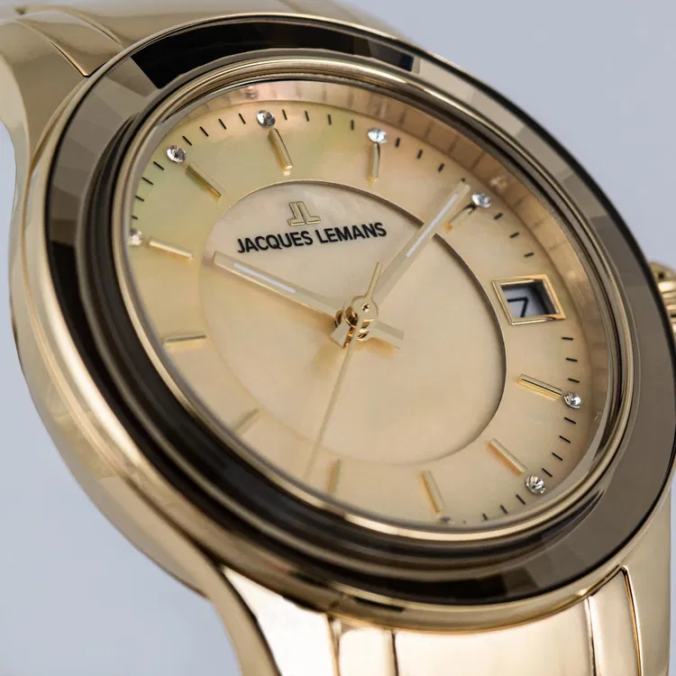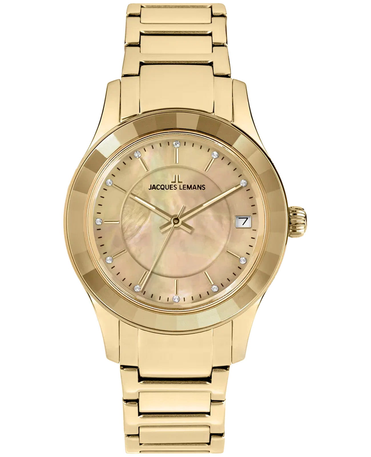 Австрийские  женские часы  Jacques Lemans 1-2194G имеют кварцевый механизм с высокой точностью. Минеральное стеклоМинеральное стеклоМинеральное стекло представляет собой искусственно выращенный минерал кварца. Такое стекло отличается особой устойчивостью к повреждениям и царапинам. Уступает по некоторым качествам сапфировому стеклу., устойчивое к появлению царапин, обладает высокой прозрачностью. Корпус часов изготовлен из нержавеющей стали с PVD-покрытиемPVDУльтратонкое покрытие наносится в технике вакуумного напыления, сочетает в себе нитрид титана особой прочности со слоем золота или оксида хрома. Несёт в себе декоративную или защитную функцию.. Стрелки с люминесцентным покрытиемЛюминесцентное покрытиеПозволяет считывать показания времени в темноте. Производители наносят на стрелки, часовые индексы, безель или поверхность циферблата светонакопительный состав, дающий холодное свечение.. Класс водозащиты: 50 метров, позволит принимать душ или плавать, не снимая часов. Стальной браслет на раскладной застёжкеРаскладная застёжкаТакой тип застёжки используется только на браслетах из металла. Она никогда не раскрывается полностью, происходит разделение на 2 и более частей. Раскладывающая застёжка снизит вероятность потери часов к минимуму..