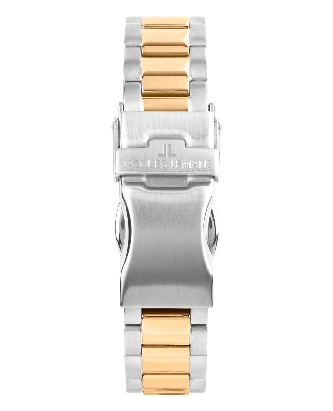 Женские часы Jacques Lemans Classic 1-2133B с минеральным стекломМинеральное стеклоМинеральное стекло представляет собой искусственно выращенный минерал кварца. Такое стекло отличается особой устойчивостью к повреждениям и царапинам. Уступает по некоторым качествам сапфировому стеклу., кварцевый механизм с высокой точностью. Корпус из нержвающей стали. БезельБезельВнешний ободок, закрепляющий стекло. В спортивных часах так называется поворотное кольцо с делениями на циферблате, выполняет роль таймера – замеряет отрезки времени на шкале. Неподвижный безель – элемент декора. Однонаправленно вращающийся безель на дайверских часах позволяет фиксировать моменты погружения и выныривания на поверхность. из нержавеющей стали с PVDPVDУльтратонкое покрытие наносится в технике вакуумного напыления, сочетает в себе нитрид титана особой прочности со слоем золота или оксида хрома. Несёт в себе декоративную или защитную функцию. покрытием украшен кристаллами Swarovski. Стрелки с люминесцентным покрытиемЛюминесцентное покрытиеПозволяет считывать показания времени в темноте. Производители наносят на стрелки, часовые индексы, безель или поверхность циферблата светонакопительный состав, дающий холодное свечение.. Окошко даты находится в положении 3 часа. Класс водозащиты: 100 метров, позволит плавать, нырять и заниматься другими водными видами спорта. Браслет из нержавеющей стали с частичным PVDPVDУльтратонкое покрытие наносится в технике вакуумного напыления, сочетает в себе нитрид титана особой прочности со слоем золота или оксида хрома. Несёт в себе декоративную или защитную функцию. покрытием на раскладной застёжкеРаскладная застёжкаТакой тип застёжки используется только на браслетах из металла. Она никогда не раскрывается полностью, происходит разделение на 2 и более частей. Раскладывающая застёжка снизит вероятность потери часов к минимуму..