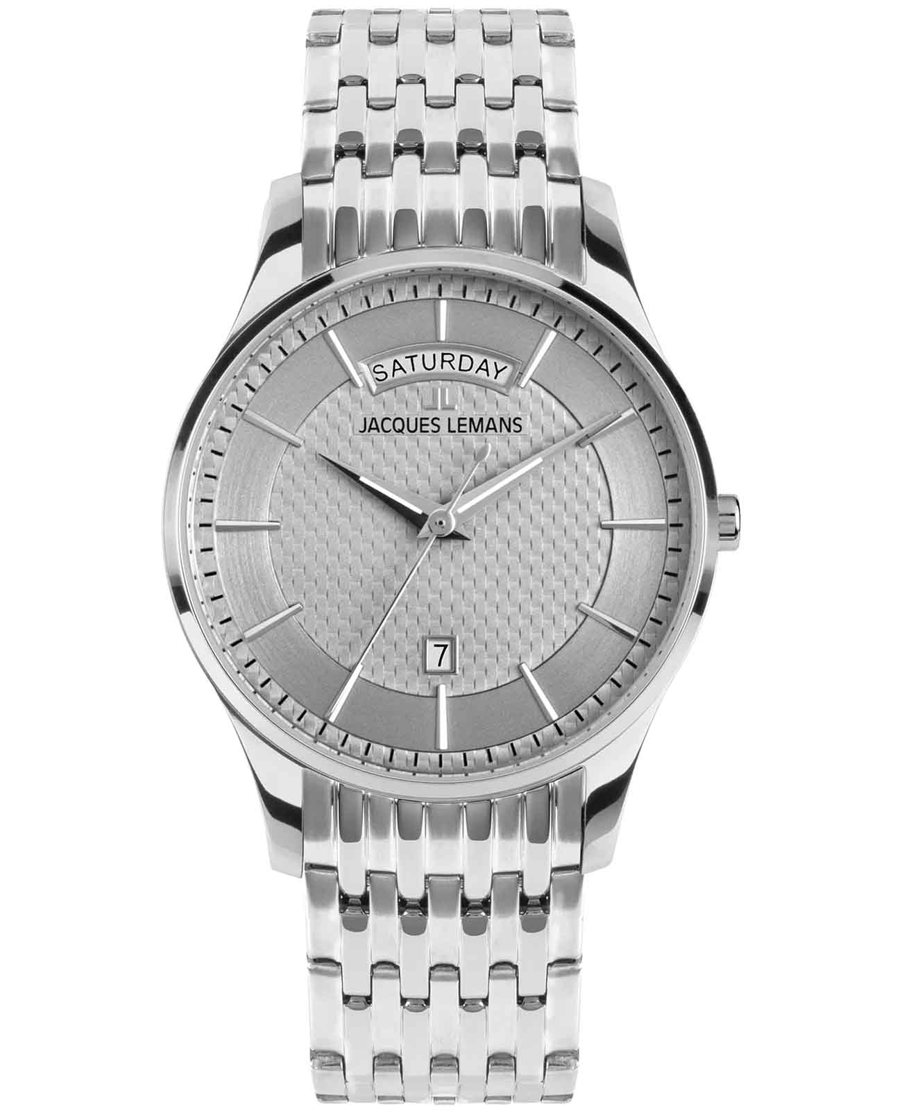 Мужские часы Jacques Lemans 1-2193G – лаконичная красота и изысканная элегантность. Корпус из нержавеющей стали диаметром 40 мм идеально сбалансирован и элегантен. Ударопрочное минеральное стеклоМинеральное стеклоМинеральное стекло представляет собой искусственно выращенный минерал кварца. Такое стекло отличается особой устойчивостью к повреждениям и царапинам. Уступает по некоторым качествам сапфировому стеклу. Crystex защищает циферблат от царапин. Стальной браслет на застёжке-бабочке с кнопкамиЗастёжка "бабочка"Такой вид застёжки дополняется предохранителями, помогающими избежать случайного раскрытия браслета. Обладают изящным исполнением. . Водозащита 50 метров защищает часы от брызг и дождя, делая их подходящими для повседневного использования. Стрелки и метки с люминесцентным покрытиемЛюминесцентное покрытиеПозволяет считывать показания времени в темноте. Производители наносят на стрелки, часовые индексы, безель или поверхность циферблата светонакопительный состав, дающий холодное свечение. позволяющие легко определять время даже в темноте. Окошко даты находится в положении 6 часов. Широкое окошко дня недели в положении 12 часов позволяет показывать название дня недели полностью, без сокращений.