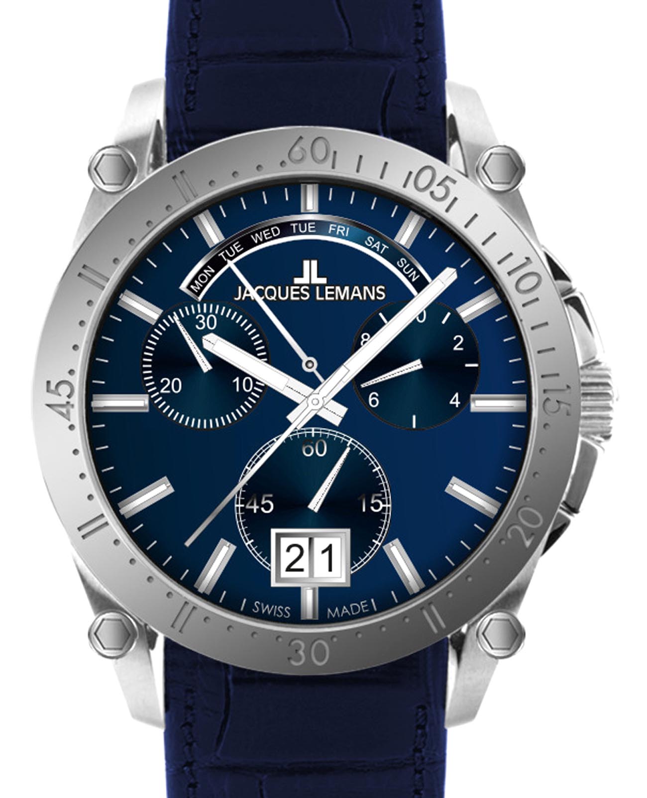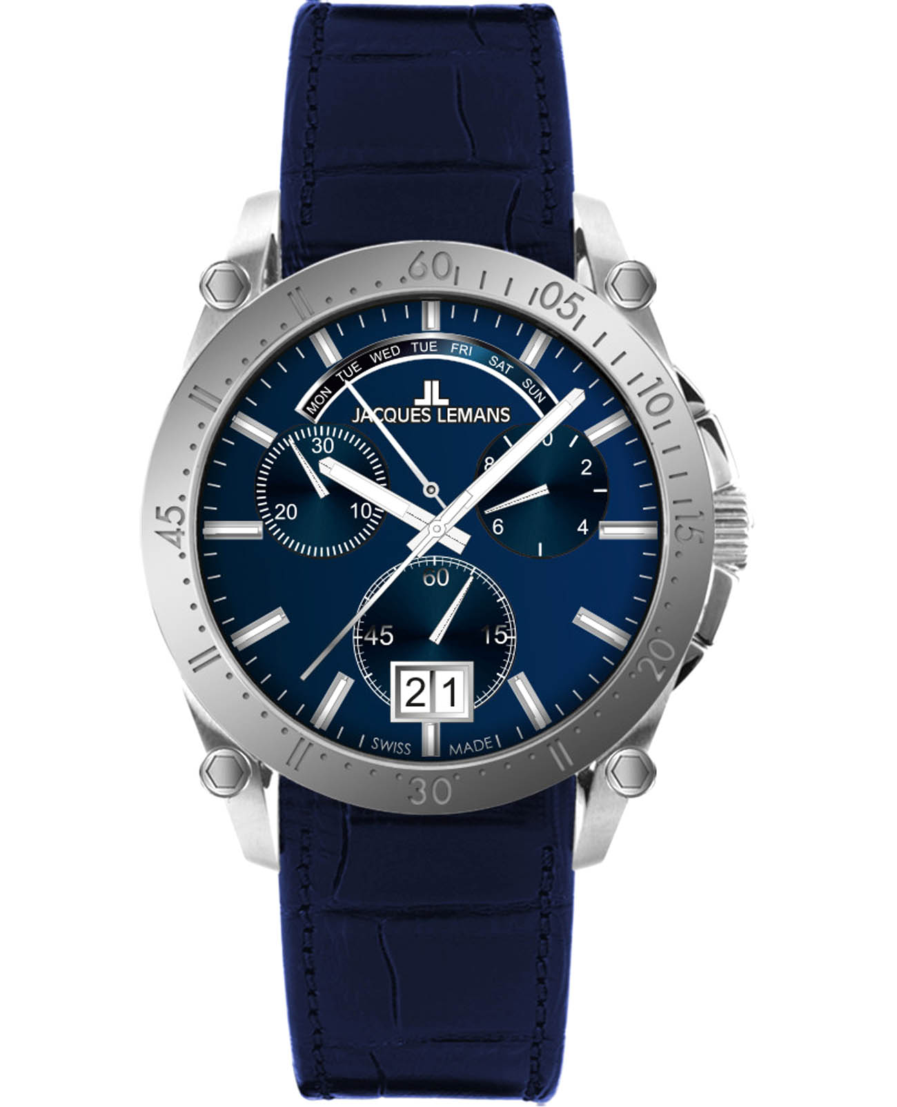 Мужские часы-хронографХронографФункция позволяет измерять отрезки времени с особой точностью: часы, минуты, секунды. Верным признаком хронографа является наличие на циферблате 3 дополнительных окошек-счётчиков. Jacques Lemans 1-2198C – лаконичная красота и изысканная элегантность. Оригинальная модель с классическим оформлением станет превосходным завершением образа, наделив его индивидуальным характером. Корпус выполнен из нержавеющей стали, диаметром 44 мм, что обеспечивает долговечность и утончённый внешний вид. Ударопрочное минеральное стеклоМинеральное стеклоМинеральное стекло представляет собой искусственно выращенный минерал кварца. Такое стекло отличается особой устойчивостью к повреждениям и царапинам. Уступает по некоторым качествам сапфировому стеклу. Crystex защищает циферблат от царапин. Кожаный ремешок на стандартной застёжке обеспечивает комфортное ношение. Водозащита 100 метров позволит плавать, нырять и заниматься другими водными видами спорта. Стрелки и метки с люминесцентным покрытиемЛюминесцентное покрытиеПозволяет считывать показания времени в темноте. Производители наносят на стрелки, часовые индексы, безель или поверхность циферблата светонакопительный состав, дающий холодное свечение. позволяющие легко определять время даже в темноте. Окошко даты находится в положении 6 часов. Широкое окошко дня недели в положении 12 часов позволяет показывать название дня недели. Это аксессуар для мужчины, который ценит классический стиль и функциональность.