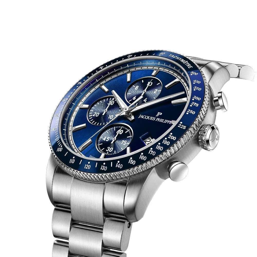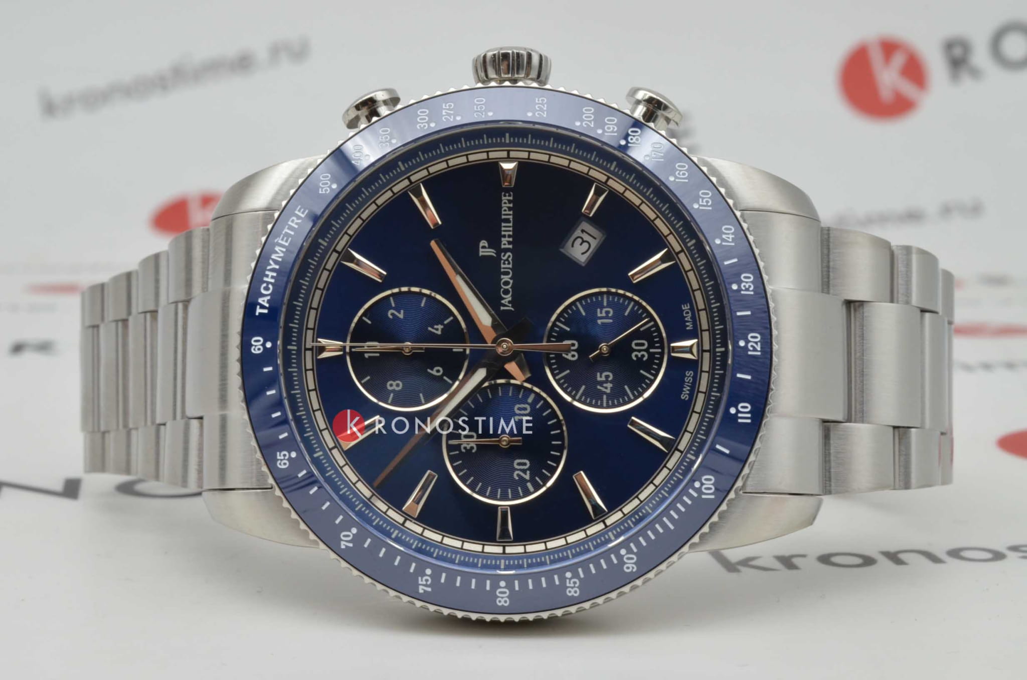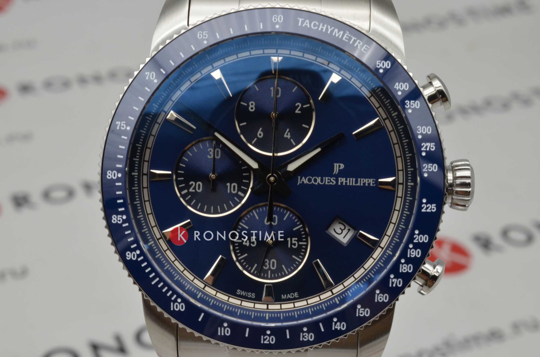 Швейцарские наручные часы Jacques Philippe JPQGC691336 сочетают в себе современный дизайн, надежность и функциональность, это стильные швейцарские часы с функцией хронографаХронографФункция позволяет измерять отрезки времени с особой точностью: часы, минуты, секунды. Верным признаком хронографа является наличие на циферблате 3 дополнительных окошек-счётчиков. и секундомераСекундомерСекундоме́р — прибор, способный измерять интервалы времени с точностью до долей секунды.. Корпус круглой формы диаметром 42 мм выполнен из прочной нержавеющей стали, а безельБезельВнешний ободок, закрепляющий стекло. В спортивных часах так называется поворотное кольцо с делениями на циферблате, выполняет роль таймера – замеряет отрезки времени на шкале. Неподвижный безель – элемент декора. Однонаправленно вращающийся безель на дайверских часах позволяет фиксировать моменты погружения и выныривания на поверхность. с элегантным синим IP-покрытиемIP-покрытиеМетод ионного напыления. Демонстрирует повышенную устойчивость к истиранию, окислению и химическим веществам. Под воздействием высокого давления и температуры около 1500°C молекулы металла надёжно соединяются с частицами корпуса часов.. Сапфировое стеклоСапфировое стеклоПрочный и надёжный материал из кристалла сапфира синтетического происхождения, характеризующийся особой твёрдостью и устойчивостью к царапинам и повреждениям. с антибликовым покрытиемАнтибликовое покрытиеСлой оксида металла в 0,13-0,3 микрон, благодаря которому стекло часов не бликует и не отражает свет. Антибликовое покрытие уменьшает отражение света в 10 раз, обеспечивая отличную читаемость показателей циферблата. надежно защищает синий циферблат от царапин и повреждений. Модель оснащена точным кварцевым механизмом, а также дополнительными функциями — тахиметромТахиметрРазмеченная шкала, располагается на ободке или безеле часов. Тахиметр позволяет рассчитать скорость на определённом участке пути, расстояние измеряется в километрах или милях. и индикатором даты, что делает часы не только стильным аксессуаром, но и практичным помощником на каждый день. Серебряный браслет шириной 22 мм удобно фиксируется на запястье с помощью застежки «бабочка»Застёжка "бабочка"Такой вид застёжки дополняется предохранителями, помогающими избежать случайного раскрытия браслета. Обладают изящным исполнением. . Стрелки имеют люминесцентное покрытиеЛюминесцентное покрытиеПозволяет считывать показания времени в темноте. Производители наносят на стрелки, часовые индексы, безель или поверхность циферблата светонакопительный состав, дающий холодное свечение. для удобства чтения времени в темноте. Водозащита 5 АТМ позволяет не снимать часы при дожде и случайных контактах с водой.