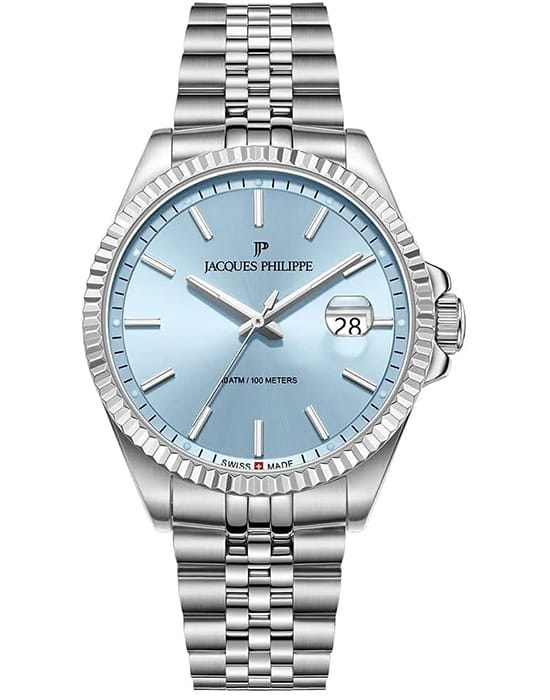 Jacques Philippe JPQGS5913X6LBV2 — мужские часы в сдержанном классическом исполнении с акцентом на простоту и надёжность. Корпус диаметром 40 мм выполнен из нержавеющей стали, а его умеренная толщина — около 12 мм — делает модель универсальной и комфортной в повседневной носке. Циферблат оформлен в светлом металлическом тоне с тонкими стрелками, лаконичными часовыми метками и аккуратным окошком даты в позиции «3 часа». Минималистичный стиль подчёркивает строгость и чистоту дизайна. Поверхность защищена устойчивым к царапинам сапфировым стекломСапфировое стеклоПрочный и надёжный материал из кристалла сапфира синтетического происхождения, характеризующийся особой твёрдостью и устойчивостью к царапинам и повреждениям., которое обеспечивает хорошую читаемость и долговечность. Механизм — точный швейцарский кварц, не требующий подзавода. Он обеспечивает стабильную и бесперебойную работу часов, сохраняя точность в любых условиях. Браслет из нержавеющей стали визуально продолжает корпус и фиксируется с помощью надёжной застёжки, обеспечивая комфортную посадку. Ширина браслета — 22 мм. Водозащита до 10 ATM позволяет использовать часы не только в повседневной жизни, но и при активности на воде. Jacques Philippe — это надёжная и универсальная модель для тех, кто ценит швейцарскую точность, простоту и уверенный стиль без лишних деталей.