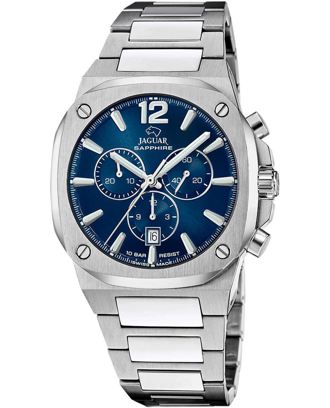Мужские швейцарские часы-хронографХронографФункция позволяет измерять отрезки времени с особой точностью: часы, минуты, секунды. Верным признаком хронографа является наличие на циферблате 3 дополнительных окошек-счётчиков. Jaguar Rond Carre J1025/1. Кварцевый швейцарский калибр Ronda 5030d. Сапфировое стеклоСапфировое стеклоПрочный и надёжный материал из кристалла сапфира синтетического происхождения, характеризующийся особой твёрдостью и устойчивостью к царапинам и повреждениям. устойчивое к мелким механическим повреждениям. Корпус и браслет часов изготовлены из нержавеющей стали. Стрелки и метки с люминесцентным покрытиемЛюминесцентное покрытиеПозволяет считывать показания времени в темноте. Производители наносят на стрелки, часовые индексы, безель или поверхность циферблата светонакопительный состав, дающий холодное свечение.. Окошко даты находится в положении 6 часов. Класс водозащиты: 100 метров, позволит плавать, нырять и заниматься другими водными видами спорта. Стальной браслет на раскладной застёжкеРаскладная застёжкаТакой тип застёжки используется только на браслетах из металла. Она никогда не раскрывается полностью, происходит разделение на 2 и более частей. Раскладывающая застёжка снизит вероятность потери часов к минимуму..