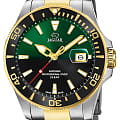 Мужские швейцарские часы Jaguar Executive Diver J863/4. Кварцевый швейцарский калибр Ronda 6003D. Сапфировое стеклоСапфировое стеклоПрочный и надёжный материал из кристалла сапфира синтетического происхождения, характеризующийся особой твёрдостью и устойчивостью к царапинам и повреждениям. устойчивое к мелким механическим повреждениям. Корпус и браслет часов изготовлены из нержавеющей стали. Стрелки и метки с люминесцентным покрытиемЛюминесцентное покрытиеПозволяет считывать показания времени в темноте. Производители наносят на стрелки, часовые индексы, безель или поверхность циферблата светонакопительный состав, дающий холодное свечение.. Окошко даты находится в положении 3 часа. Класс водозащиты: 200 метров, позволит плавать, нырять и заниматься другими водными видами спорта. Стальной браслет с частичным PVD-покрытиемPVDУльтратонкое покрытие наносится в технике вакуумного напыления, сочетает в себе нитрид титана особой прочности со слоем золота или оксида хрома. Несёт в себе декоративную или защитную функцию. на раскладной застёжкеРаскладная застёжкаТакой тип застёжки используется только на браслетах из металла. Она никогда не раскрывается полностью, происходит разделение на 2 и более частей. Раскладывающая застёжка снизит вероятность потери часов к минимуму.. БезельБезельВнешний ободок, закрепляющий стекло. В спортивных часах так называется поворотное кольцо с делениями на циферблате, выполняет роль таймера – замеряет отрезки времени на шкале. Неподвижный безель – элемент декора. Однонаправленно вращающийся безель на дайверских часах позволяет фиксировать моменты погружения и выныривания на поверхность. с PVD-покрытиемPVDУльтратонкое покрытие наносится в технике вакуумного напыления, сочетает в себе нитрид титана особой прочности со слоем золота или оксида хрома. Несёт в себе декоративную или защитную функцию..