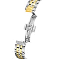 Женские швейцарские часы Jaguar Automatic Woman J998/1, механизм — автоподзавод. В часах с автоподзаводом заводная головка практически не используется, что исключает истирание ее материала и материала корпуса. Сапфировое стеклоСапфировое стеклоПрочный и надёжный материал из кристалла сапфира синтетического происхождения, характеризующийся особой твёрдостью и устойчивостью к царапинам и повреждениям. устойчивое к мелким механическим повреждениям. Корпус и браслет часов изготовлены из нержавеющей стали. Окошко даты находится в положении 6 часов. Класс водозащиты: 50 метров, позволит защитить корпус от случайных брызг или капель дождя. Стальной браслет с частичным PVD-покрытиемPVDУльтратонкое покрытие наносится в технике вакуумного напыления, сочетает в себе нитрид титана особой прочности со слоем золота или оксида хрома. Несёт в себе декоративную или защитную функцию. на застёжке-бабочке с кнопкамиЗастёжка "бабочка"Такой вид застёжки дополняется предохранителями, помогающими избежать случайного раскрытия браслета. Обладают изящным исполнением. . БезельБезельВнешний ободок, закрепляющий стекло. В спортивных часах так называется поворотное кольцо с делениями на циферблате, выполняет роль таймера – замеряет отрезки времени на шкале. Неподвижный безель – элемент декора. Однонаправленно вращающийся безель на дайверских часах позволяет фиксировать моменты погружения и выныривания на поверхность. с PVD-покрытиемPVDУльтратонкое покрытие наносится в технике вакуумного напыления, сочетает в себе нитрид титана особой прочности со слоем золота или оксида хрома. Несёт в себе декоративную или защитную функцию. инкрустирован цирконием.