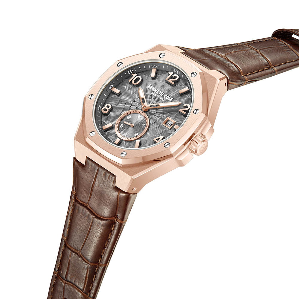 Мужские механические часы с автоподзаводом Kenneth Cole KCWGX0059002 — это стильный и современный аксессуар с выразительным дизайном. Корпус размером 43 × 50 мм выполнен из стали с IP-покрытиемIP-покрытиеМетод ионного напыления. Демонстрирует повышенную устойчивость к истиранию, окислению и химическим веществам. Под воздействием высокого давления и температуры около 1500°C молекулы металла надёжно соединяются с частицами корпуса часов. розового золота. Циферблат серого цвета оформлен метками в виде арабских цифр и штрихов, а секундная стрелка вынесена на отдельный малый циферблат. Окошко даты расположено в положении 3 часов. Циферблат защищён минеральным стекломМинеральное стеклоМинеральное стекло представляет собой искусственно выращенный минерал кварца. Такое стекло отличается особой устойчивостью к повреждениям и царапинам. Уступает по некоторым качествам сапфировому стеклу.. Часы оснащены ремешком из натуральной кожи коричневого цвета с классической пряжкой. Водонепроницаемость 50 м позволяет использовать часы для плавания и повседневного ношения.