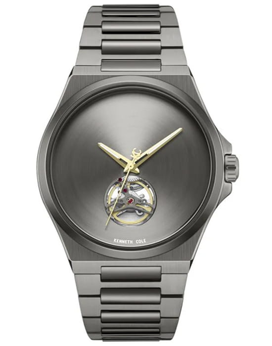 Kenneth Cole KCWGY0067403 — мужская автоматическая модель с современным минималистичным дизайном и акцентом на архитектурные линии. Корпус и браслет выполнены из нержавеющей стали с тёмным PVDPVDУльтратонкое покрытие наносится в технике вакуумного напыления, сочетает в себе нитрид титана особой прочности со слоем золота или оксида хрома. Несёт в себе декоративную или защитную функцию.-покрытием, что придаёт часам стильный и строгий облик. В центре внимания — циферблат с открытым окном, через которое можно наблюдать за работой автоматического механизма. Стрелки покрыты люминесцентным покрытиемЛюминесцентное покрытиеПозволяет считывать показания времени в темноте. Производители наносят на стрелки, часовые индексы, безель или поверхность циферблата светонакопительный состав, дающий холодное свечение., обеспечивающим читаемость в условиях слабого освещения. Защиту конструкции выполняет минеральное стеклоМинеральное стеклоМинеральное стекло представляет собой искусственно выращенный минерал кварца. Такое стекло отличается особой устойчивостью к повреждениям и царапинам. Уступает по некоторым качествам сапфировому стеклу., устойчивое к повседневным повреждениям. Браслет оснащён раскладной застёжкойРаскладная застёжкаТакой тип застёжки используется только на браслетах из металла. Она никогда не раскрывается полностью, происходит разделение на 2 и более частей. Раскладывающая застёжка снизит вероятность потери часов к минимуму., гарантирующей удобство фиксации и надёжность при носке. Модель сочетает техническую эстетику сквозного механизма и современный характер, подчёркивая индивидуальность владельца.